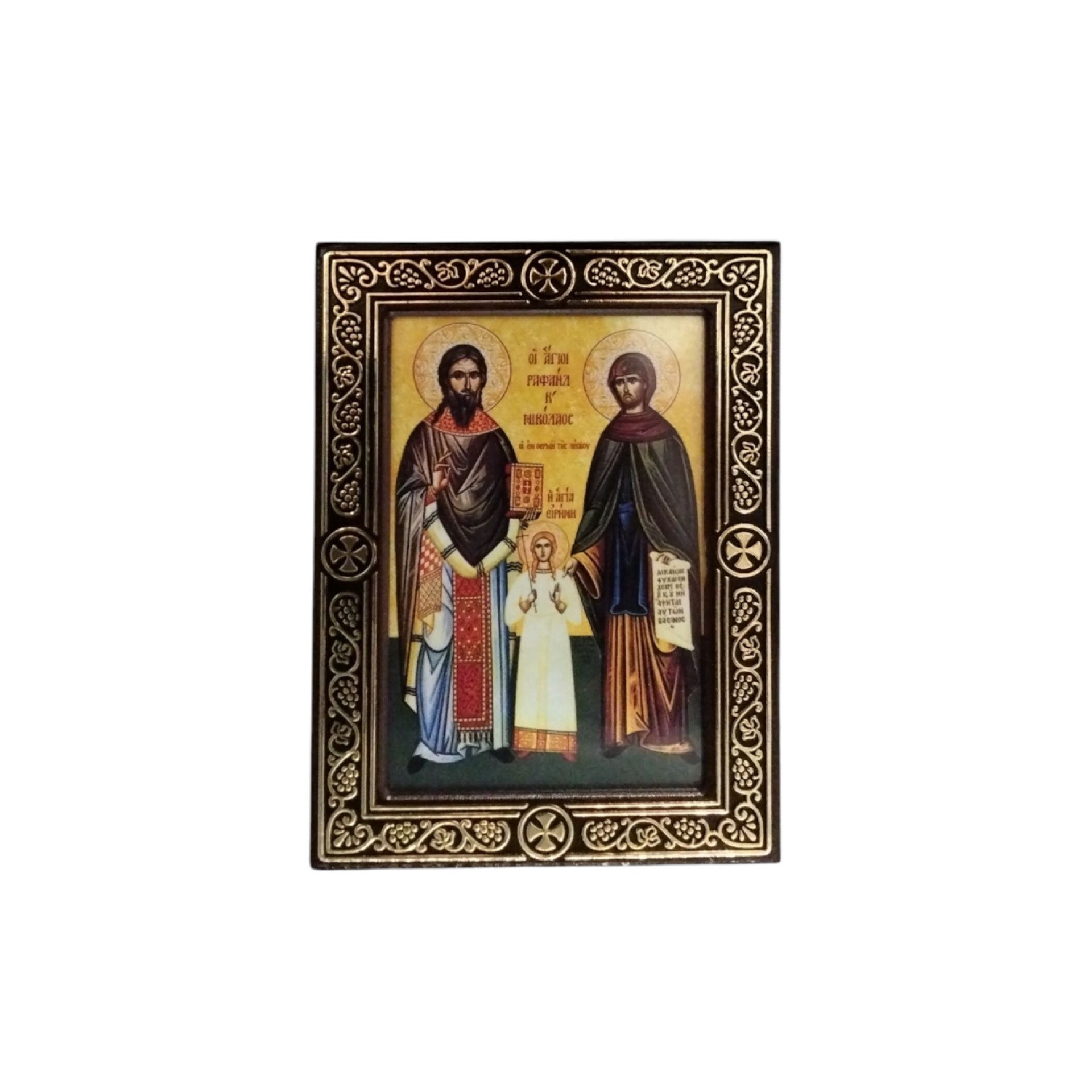 Κομψή εικόνα των Αγίων Ραφαήλ και Νικολάου, με λεπτομερή αγιογραφική απόδοση και διακοσμητικό πλαίσιο με χρυσοποίκιλτα σχέδια. Στο πίσω μέρος διαθέτει ενσωματωμένη βάση στήριξης για εύκολη τοποθέτηση σε γραφείο, ράφι, κομοδίνο ή εικονοστάσι. Χαρακτηριστικά: Διαστάσεις: 8 × 12 cm Διαθέτει βάση στήριξης Διακοσμητικό πλαίσιο με χρυσές λεπτομέρειες Εκτύπωση υψηλής ποιότητας Ιδανικό για δώρο ή καθημερινή πνευματική ενίσχυση