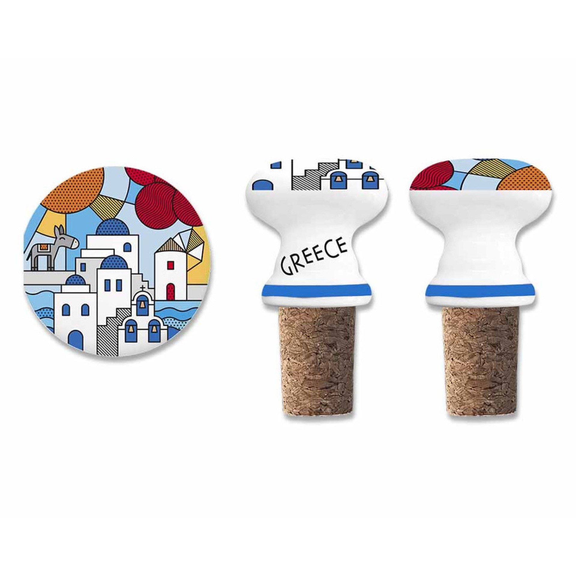 Πώμα κρασιού από κεραμικό και φελλό με πολύχρωμο σχέδιο εμπνευσμένο από τα ελληνικά νησιά. Απεικονίζει τα χαρακτηριστικά λευκά σπίτια, τους μπλε τρούλους και τον γαϊδουράκο της Ελλάδας. Ένα κομψό και πρακτικό αναμνηστικό που συνδυάζει παράδοση και design — ιδανικό δώρο για λάτρεις της Ελλάδας.