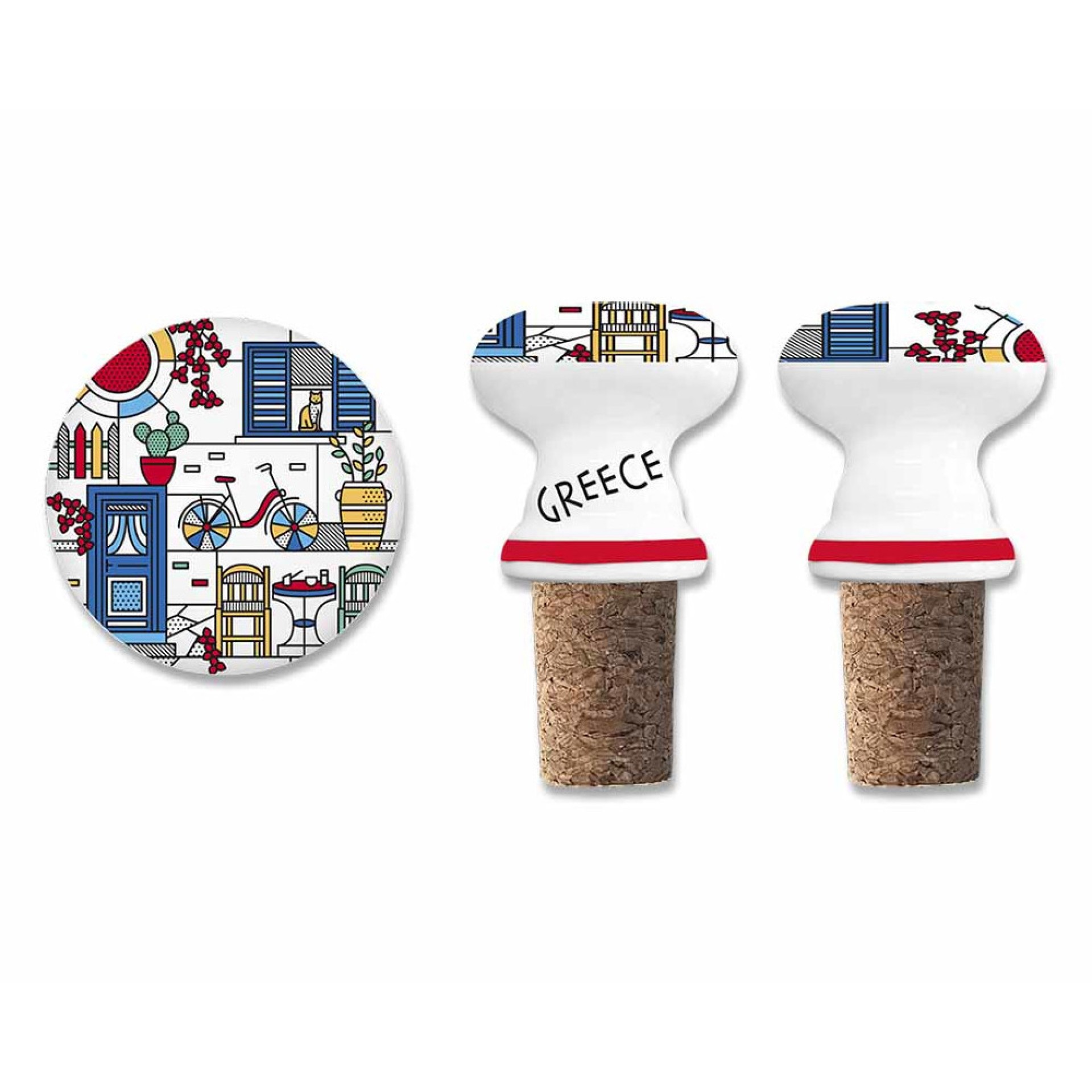 Πώμα κρασιού από κεραμικό και φελλό με σχέδιο εμπνευσμένο από ένα παραδοσιακό ελληνικό καφενείο. Πολύχρωμες λεπτομέρειες όπως ποδήλατο, καρέκλες, γάτα και λουλούδια αποπνέουν τη γοητεία και τη χαλαρή ατμόσφαιρα της Ελλάδας. Ένα κομψό και πρακτικό αναμνηστικό που ενώνει την παράδοση με το σύγχρονο design.