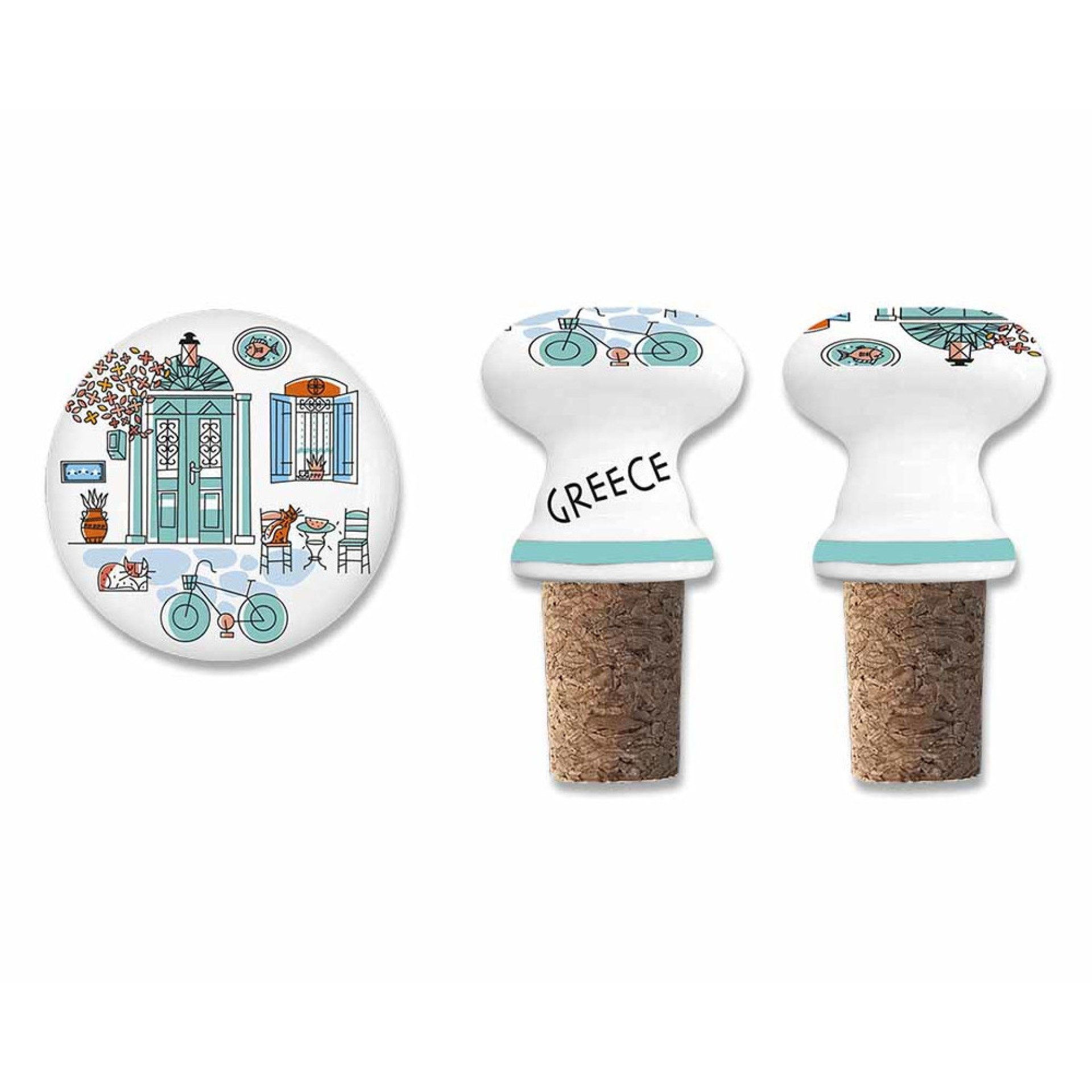 Πώμα κρασιού από κεραμικό και φελλό με σχέδιο “Kafeneio”, εμπνευσμένο από τη γνήσια ελληνική παράδοση. Το μοτίβο απεικονίζει μια τυπική σκηνή ελληνικού καφενείου με ποδήλατο, γλάστρες, γάτες και καρέκλες — σύμβολα της χαλαρής ζωής και φιλοξενίας της Ελλάδας. Μια κομψή και λειτουργική πινελιά για κάθε μπουκάλι κρασιού. Υλικό: Κεραμικό & φυσικός φελλός Διαστάσεις: περίπου 4 X 7 εκ. Χώρα προέλευσης: Ελλάδα