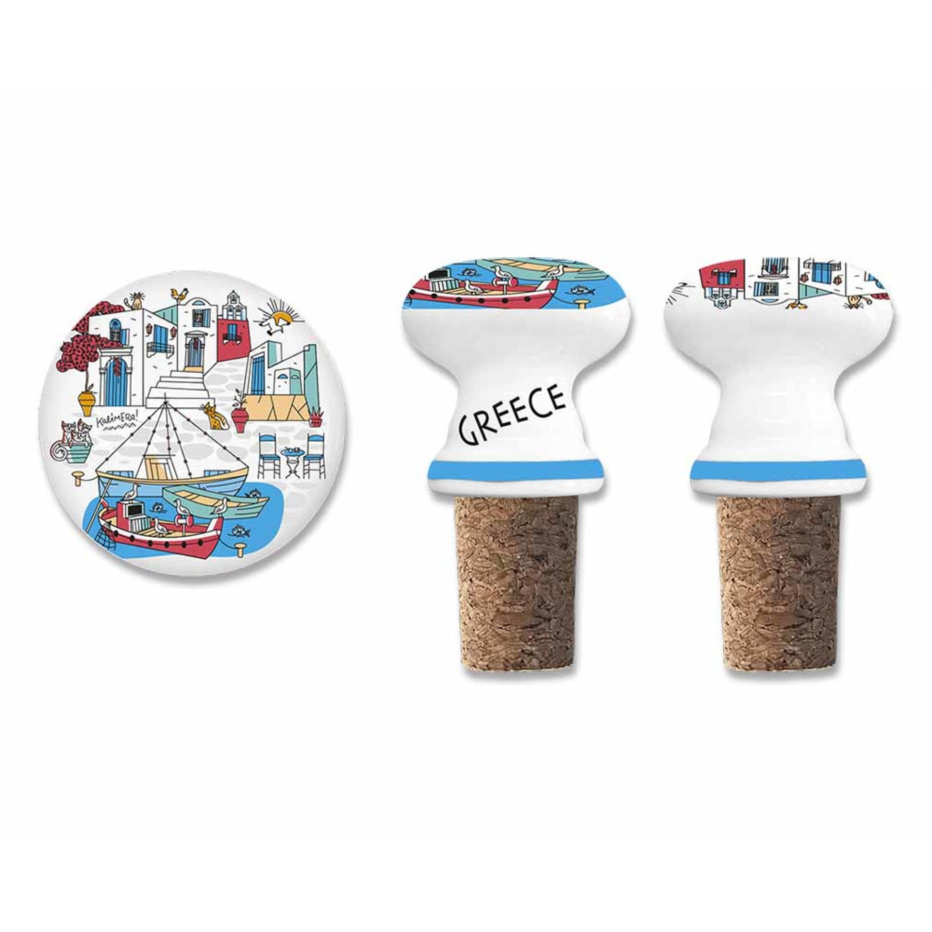 Πώμα κρασιού από κεραμικό και φελλό με σχέδιο που απεικονίζει ένα ελληνικό λιμανάκι με ψαροκάικα, γάτες και λευκά νησιώτικα σπίτια. Το πολύχρωμο σχέδιο “Kalimera Greece” αποπνέει καλοκαιρινή αύρα και μεσογειακή γοητεία. Ένα πρακτικό και καλαίσθητο αναμνηστικό, ιδανικό για κάθε φίλο της Ελλάδας.
