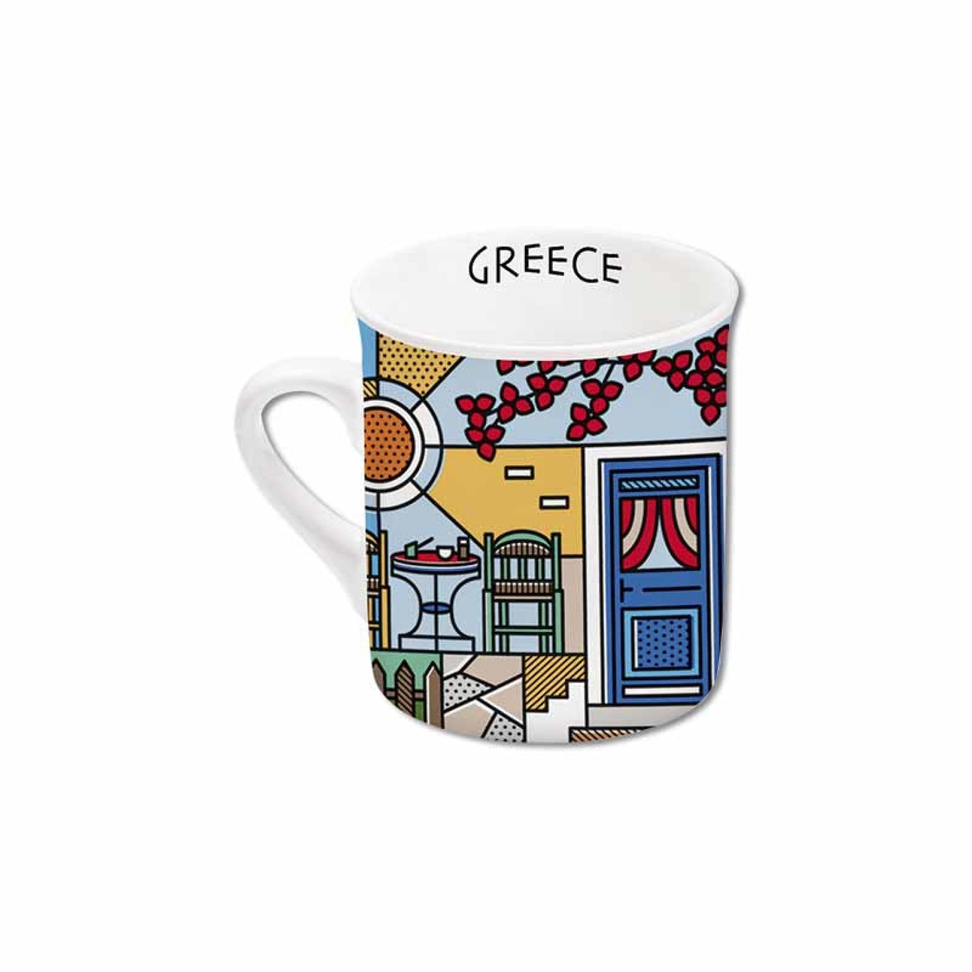 Κεραμική κούπα espresso “Καφενείο & Ποδήλατο”, με σχέδιο που αποτυπώνει τη χαλαρή και πολύχρωμη πλευρά της ελληνικής ζωής. Καρέκλες, τραπεζάκι, ποδήλατο, γάτα στο παράθυρο και βουκαμβίλιες δημιουργούν ένα σκηνικό γεμάτο καλοκαιρινή νοσταλγία και γαλήνη. Υλικό: Κεραμικό Χωρητικότητα: 140 ml Χώρα προέλευσης: Ελλάδα