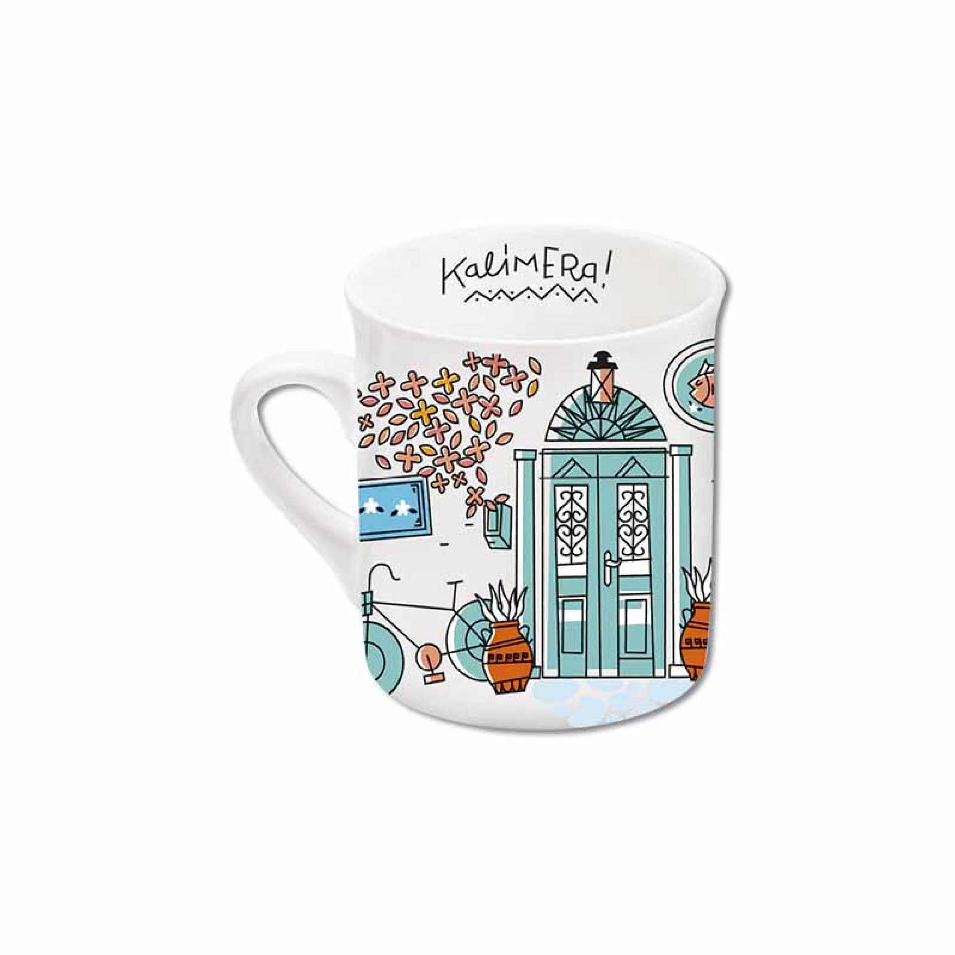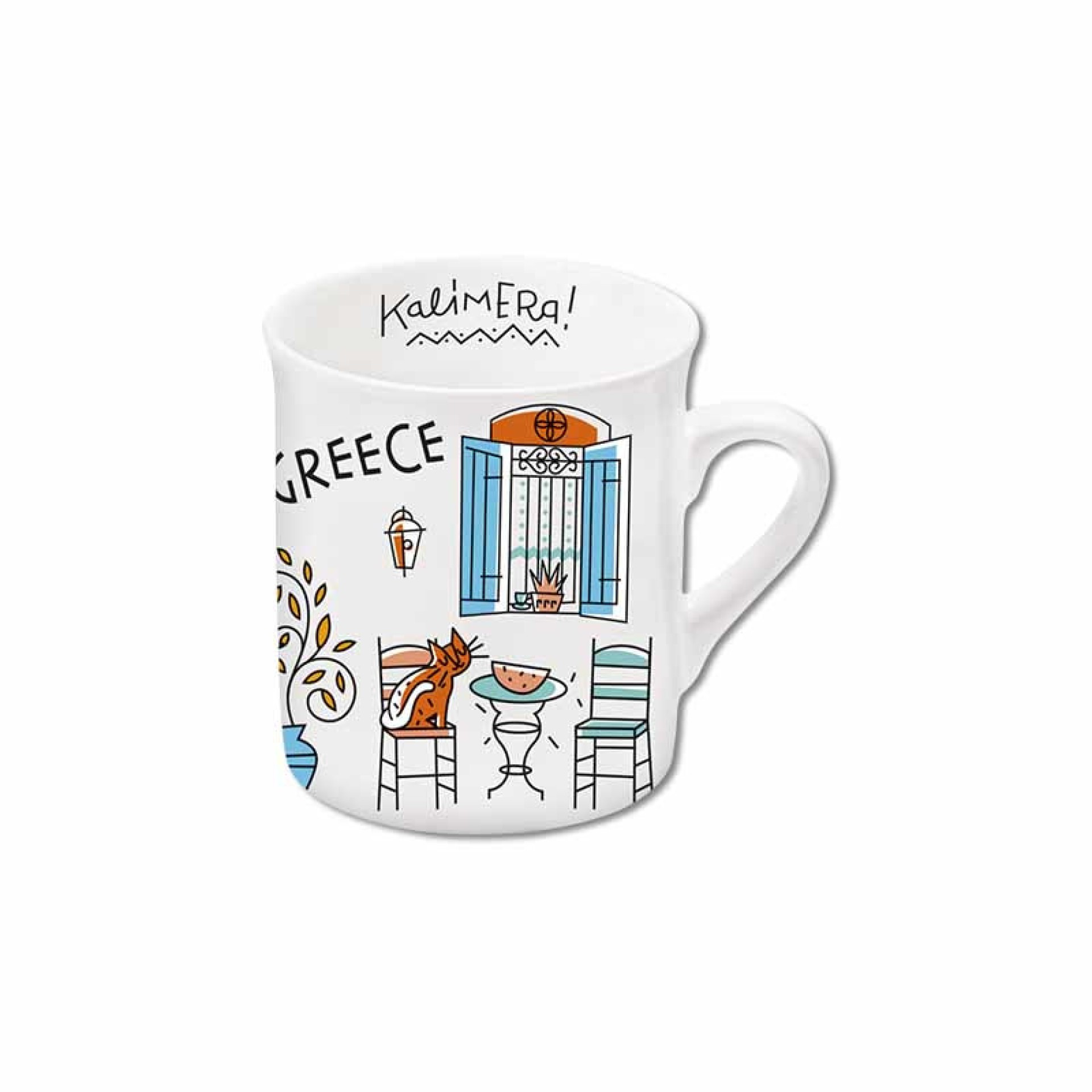 Κεραμική κούπα espresso “Καφενείο”, με σχέδιο εμπνευσμένο από την παραδοσιακή ελληνική αυλή και τα καφενεία της γειτονιάς. Χαλαρή καλοκαιρινή ατμόσφαιρα, καρέκλες, τραπεζάκι, γάτα και το μήνυμα “Kalimera!” στο εσωτερικό, για να ξεκινάει η μέρα με χαμόγελο.