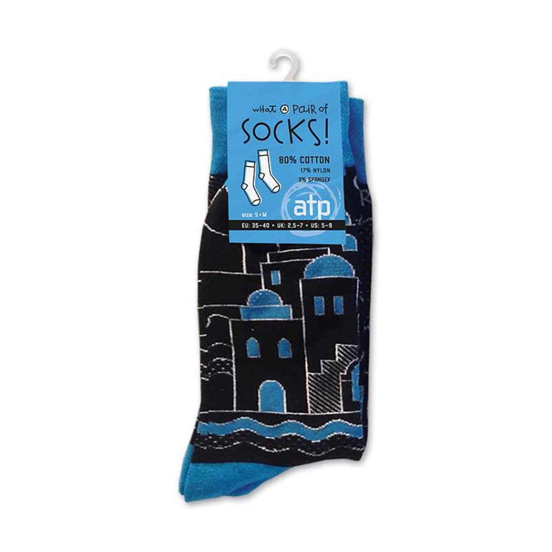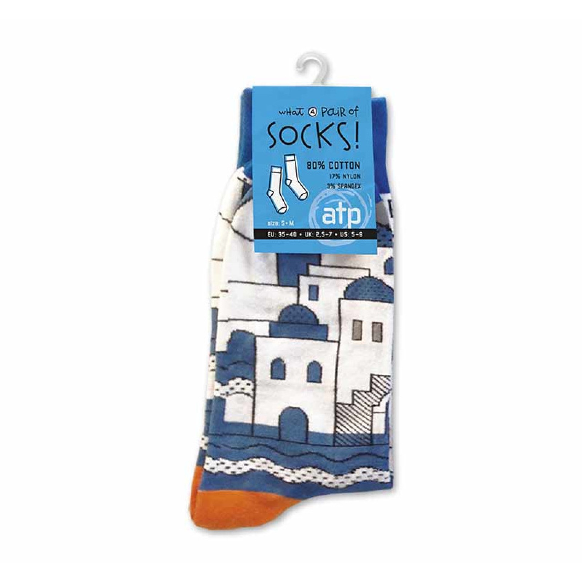 Φέρτε την ομορφιά των Ελληνικών Νησιών στα βήματά σας με αυτές τις υπέροχες κάλτσες! Το σχέδιο είναι εμπνευσμένο από τα παραδοσιακά λευκά σπιτάκια με τους μπλε τρούλους που κοσμούν νησιά όπως η Σαντορίνη και η Μύκονος. Το μοτίβο “GREECE” και οι έντονες αποχρώσεις του μπλε, του λευκού και του πορτοκαλί (ή του μαύρου με μπλε λεπτομέρειες) δημιουργούν μια ζωντανή, καλοκαιρινή εικόνα της Ελλάδας. Κατασκευασμένες από 80% βαμβάκι, 17% νάιλον και 3% σπάντεξ, προσφέρουν απαλότητα, άνεση και μεγάλη αντοχή. Ιδανικές για καθημερινή χρήση, ταξίδια ή ως μοναδικό αναμνηστικό δώρο που αποπνέει ελληνική παράδοση και στυλ. Διαθέσιμες σε: Δύο χρώματα: Λευκό-Μπλε-Πορτοκαλί & Μαύρο-Μπλε Δύο μεγέθη: S–M (EU 35–40) και L–XL (EU 41–46) Φορέστε τις και μεταφέρετε την ελληνική καλοκαιρινή αύρα παντού!
