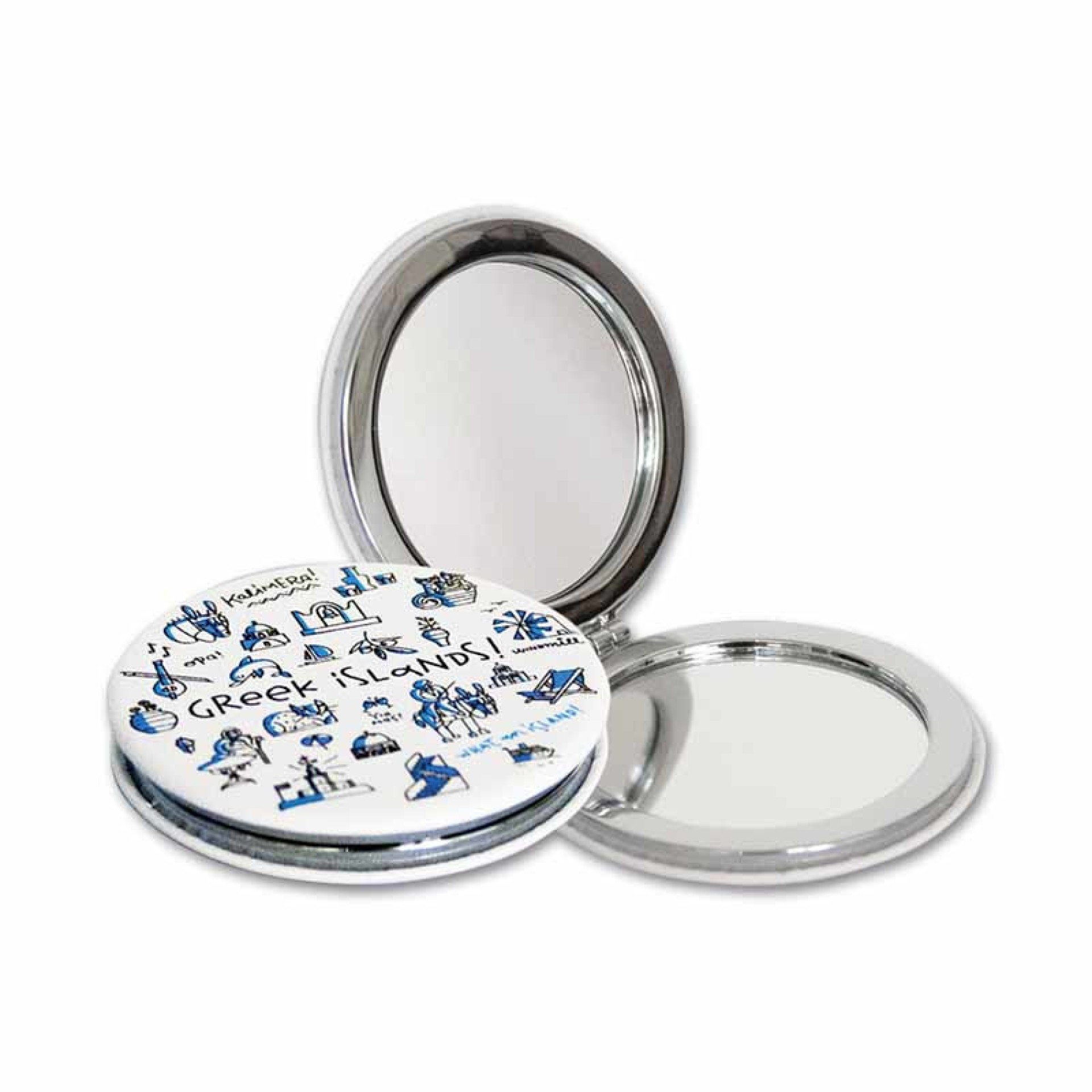 Το καθρεφτάκι GREECE Greek Islands αποτυπώνει τη γοητεία των ελληνικών νησιών μέσα από ένα μοντέρνο, καλλιτεχνικό σχέδιο σε αποχρώσεις του λευκού και του μπλε. Διαθέτει ανθεκτική μεταλλική κατασκευή και διπλό καθρέφτη (κανονικό & μεγεθυντικό), ιδανικό για χρήση όπου κι αν βρίσκεστε. Ελαφρύ και κομψό, χωράει εύκολα στην τσάντα, στο νεσεσέρ ή ακόμα και στην τσέπη. Ένα υπέροχο αναμνηστικό ή δώρο από την Ελλάδα! Χαρακτηριστικά: Υλικό: Μεταλλικός σκελετός με γυαλιστερό φινίρισμα Σχήμα: Στρογγυλό Καθρέφτης: Διπλός (κανονικός και μεγεθυντικός) Σχέδιο: Greek Islands – Ελληνικά νησιά Χρώματα: Μπλε & λευκό Διαστάσεις: ∅ 6,5 εκ. περίπου Ιδανικό για ταξίδι ή ως ελληνικό σουβενίρ