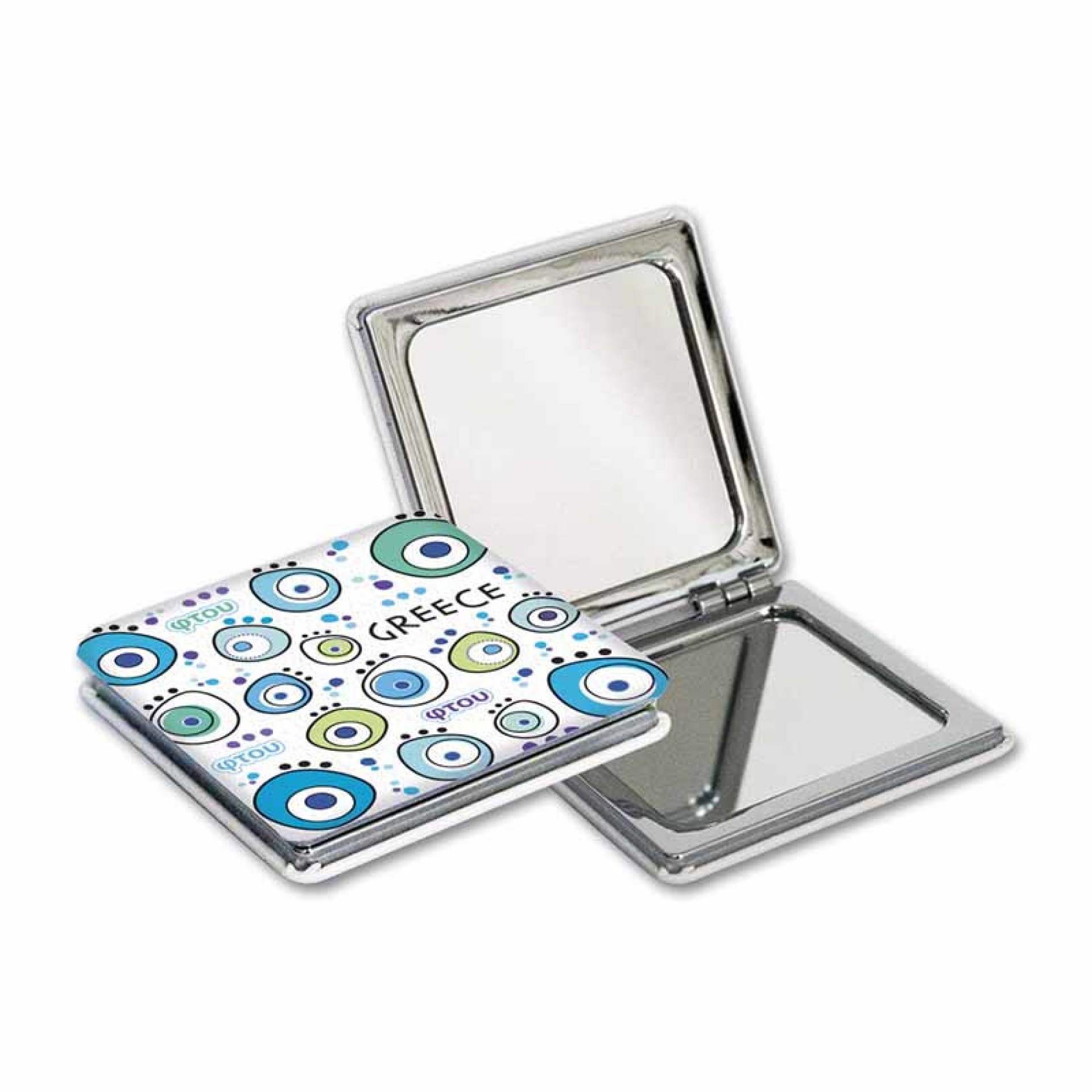 Το καθρεφτάκι GREECE "Φτου Φτου" είναι εμπνευσμένο από το παραδοσιακό γαλάζιο μάτι, το αγαπημένο ελληνικό σύμβολο που προστατεύει από τη βασκανία. Το χαρούμενο, πολύχρωμο σχέδιο με τη λέξη "Φτου!" αποπνέει αισιοδοξία και ελληνική ενέργεια. Διαθέτει ανθεκτική μεταλλική κατασκευή και διπλό καθρέφτη (κανονικό και μεγεθυντικό), ιδανικό για καθημερινή χρήση ή ταξίδι. Ένα πρακτικό και κομψό σουβενίρ από την Ελλάδα! Χαρακτηριστικά: Υλικό: Μεταλλικός σκελετός με γυαλιστερό φινίρισμα Σχήμα: Τετράγωνο Καθρέφτης: Διπλός (κανονικός & μεγεθυντικός) Σχέδιο: Πολύχρωμα μάτια με το μήνυμα “Φτου!” Διαστάσεις: 6 x 6 εκ. περίπου Ιδανικό για ταξίδι, καθημερινή χρήση ή δώρο