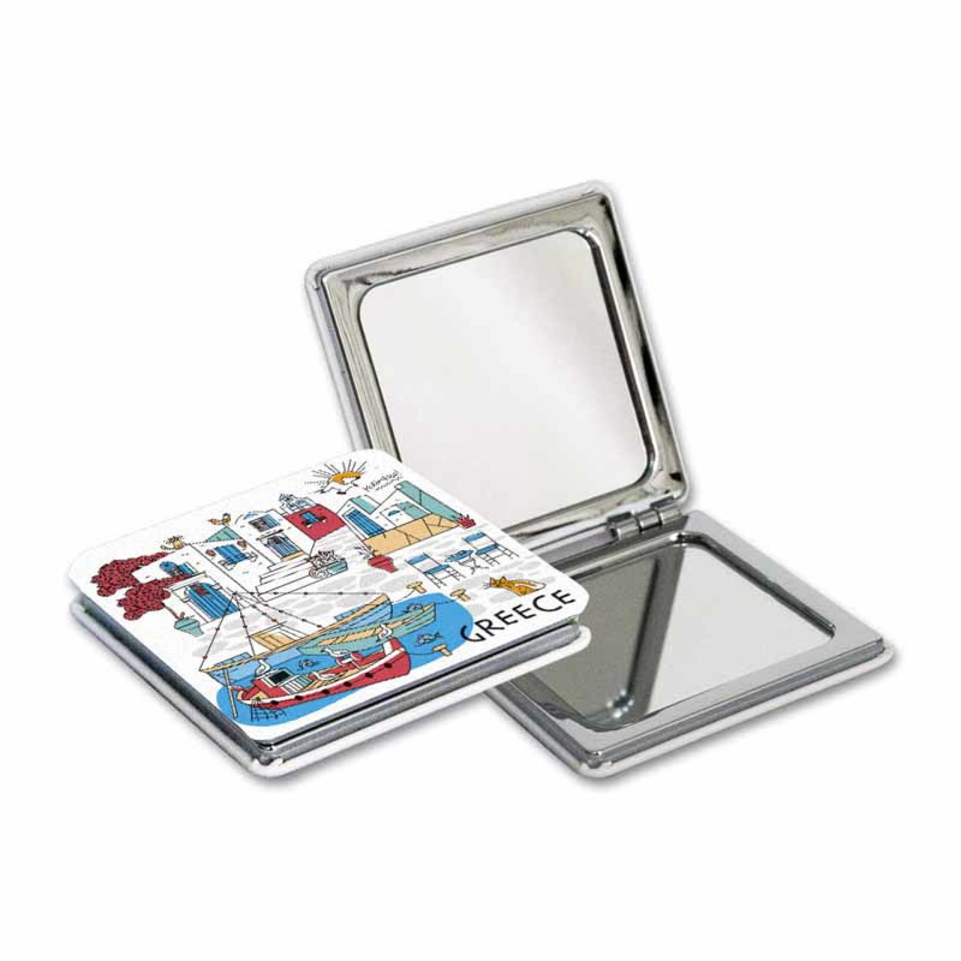 Το καθρεφτάκι GREECE Καραβάκι αποτυπώνει τη μαγεία του ελληνικού καλοκαιριού μέσα από ένα γραφικό λιμανάκι με ψαροκάικα, γαλάζια παράθυρα και λευκά σπιτάκια κάτω από τον ήλιο.