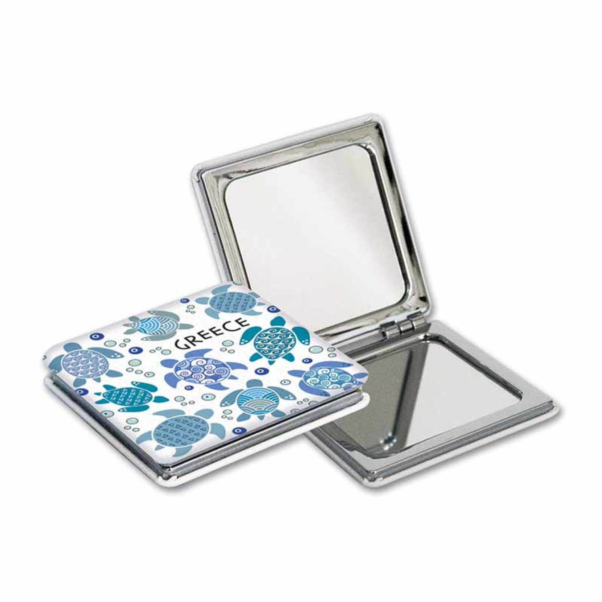 Το καθρεφτάκι GREECE Χελώνες είναι εμπνευσμένο από την αγαπημένη θαλάσσια χελώνα Caretta caretta, που ζει στα γαλανά νερά της Ελλάδας. Το χαριτωμένο σχέδιο με γαλάζιες και τιρκουάζ χελώνες αποπνέει καλοκαιρινή διάθεση και ελληνική αρμονία. Με ανθεκτική μεταλλική κατασκευή και διπλό καθρέφτη (κανονικό και μεγεθυντικό), είναι ιδανικό για καθημερινή χρήση ή ταξίδι. Ένα κομψό και ιδιαίτερο σουβενίρ από την Ελλάδα! Χαρακτηριστικά: Υλικό: Μεταλλικός σκελετός με γυαλιστερό φινίρισμα Σχήμα: Τετράγωνο Καθρέφτης: Διπλός (κανονικός & μεγεθυντικός) Σχέδιο: Θαλάσσιες χελώνες Caretta σε αποχρώσεις του μπλε Διαστάσεις: 6 × 6 εκ. περίπου Ελαφρύ, πρακτικό και ταξιδιωτικό