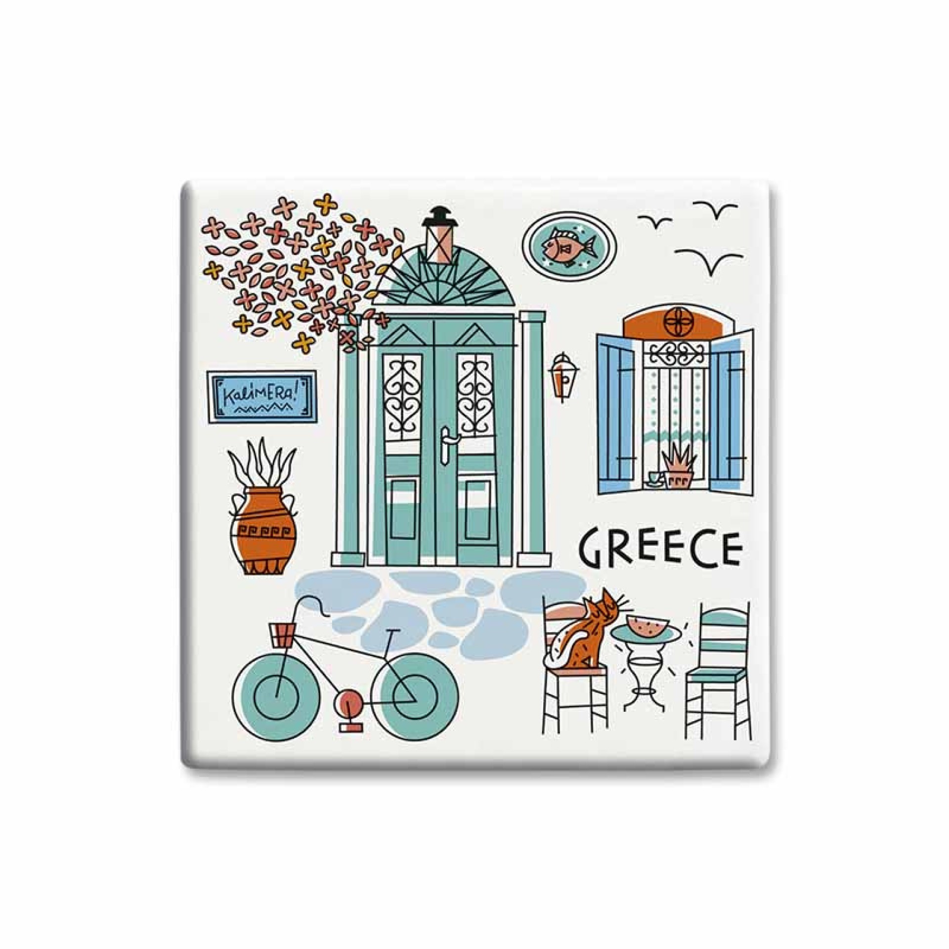 Το κεραμικό σουβέρ “Kafeneio” αποπνέει την αυθεντική γοητεία της παραδοσιακής ελληνικής ζωής. Το σχέδιο απεικονίζει μια γραφική αυλή καφενείου, με πορτοκαλί και μπλε τόνους, καρέκλες, τραπεζάκι, ποδήλατο, γάτα και φυτά — μια σκηνή που θυμίζει καλοκαιρινό μεσημέρι στην Ελλάδα. Το σχέδιο συνδυάζει τη γραμμική εικονογράφηση με σύγχρονη αισθητική και ζεστά χρώματα, προσφέροντας μια νοσταλγική αλλά φρέσκια ματιά στην ελληνική κουλτούρα. Κατασκευασμένο από ανθεκτικό κεραμικό, διαθέτει λεία, θερμοανθεκτική επιφάνεια και αντιολισθητική βάση. Χαρακτηριστικά: Υλικό: Κεραμικό Διαστάσεις: 10.8 × 10.8 cm Θερμοανθεκτική, λεία επιφάνεια Αντιολισθητική βάση Σχέδιο: “Kafeneio” — εμπνευσμένο από την παραδοσιακή ελληνική αυλή Ιδανικό για χρήση ή διακόσμηση Ελληνικός σχεδιασμός