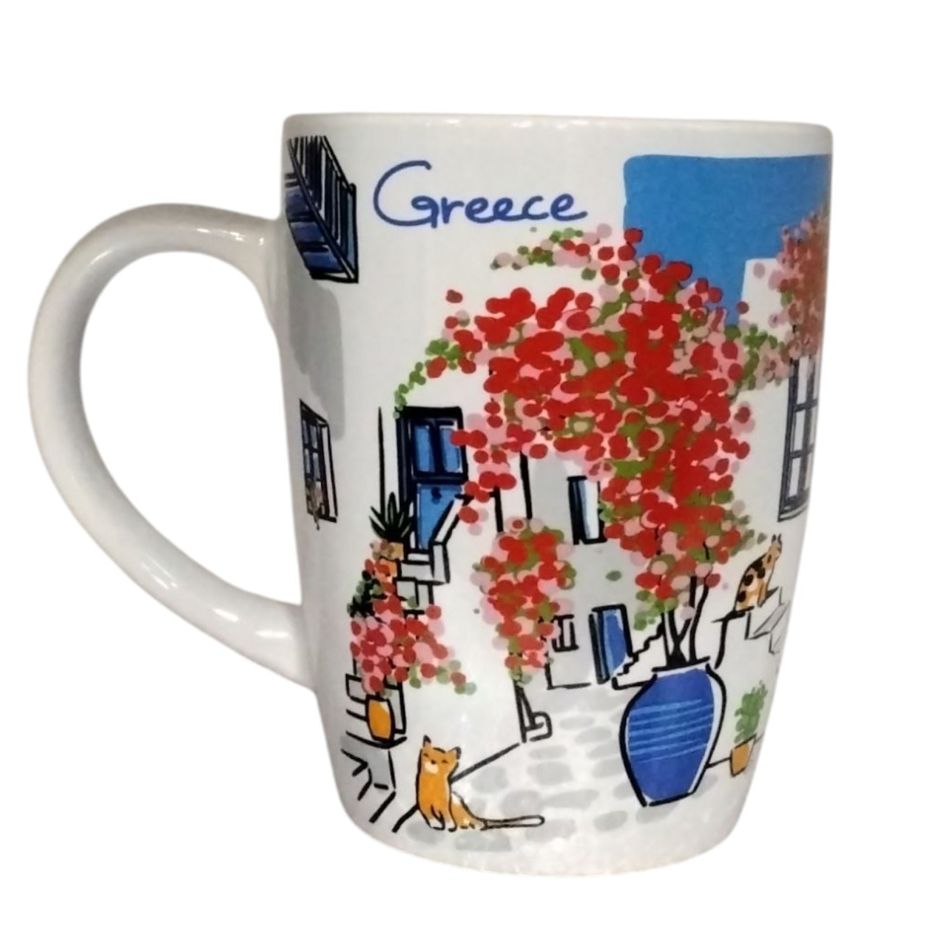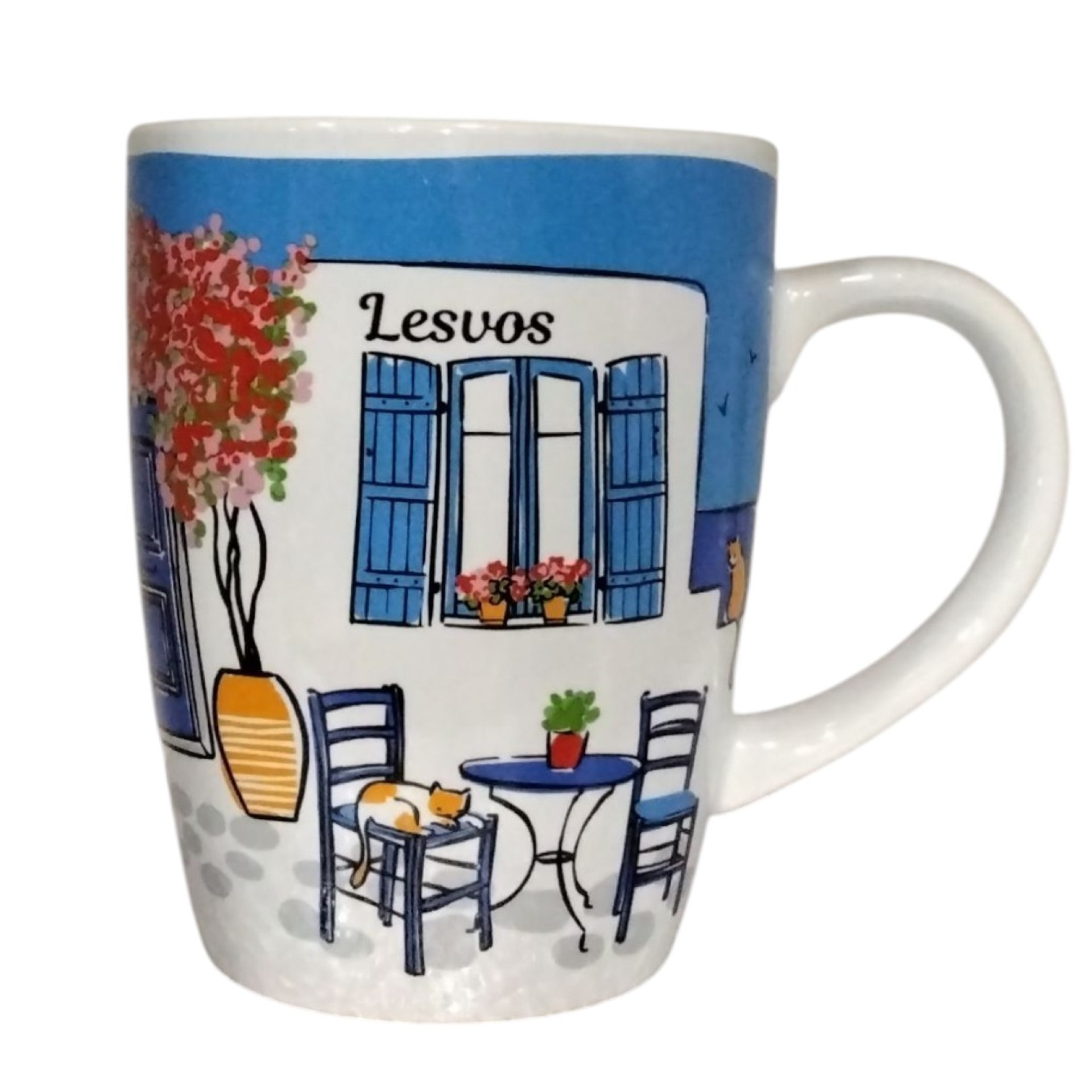 Όμορφη κούπα πορσελάνης με χωρητικότητα 320 ml, διακοσμημένη με γραφικό ελληνικό σοκάκι, μπλε παράθυρα, ανθισμένες βουκαμβίλιες και γατούλες που συμπληρώνουν τη γοητευτική καλοκαιρινή ατμόσφαιρα της Λέσβου. Το χαρούμενο χρωματικό σύνολο και οι λεπτομέρειες θυμίζουν αυθεντικές εικόνες από τα ελληνικά νησιά. Ιδανική για καφέ, τσάι ή ως υπέροχο αναμνηστικό. Χαρακτηριστικά: Υλικό: Πορσελάνη Χωρητικότητα: 320 ml Σχέδιο ελληνικού νησιώτικου τοπίου με βουκαμβίλιες & γάτες Κατάλληλη για ζεστά και κρύα ροφήματα Εξαιρετική επιλογή για δώρο ή souvenir