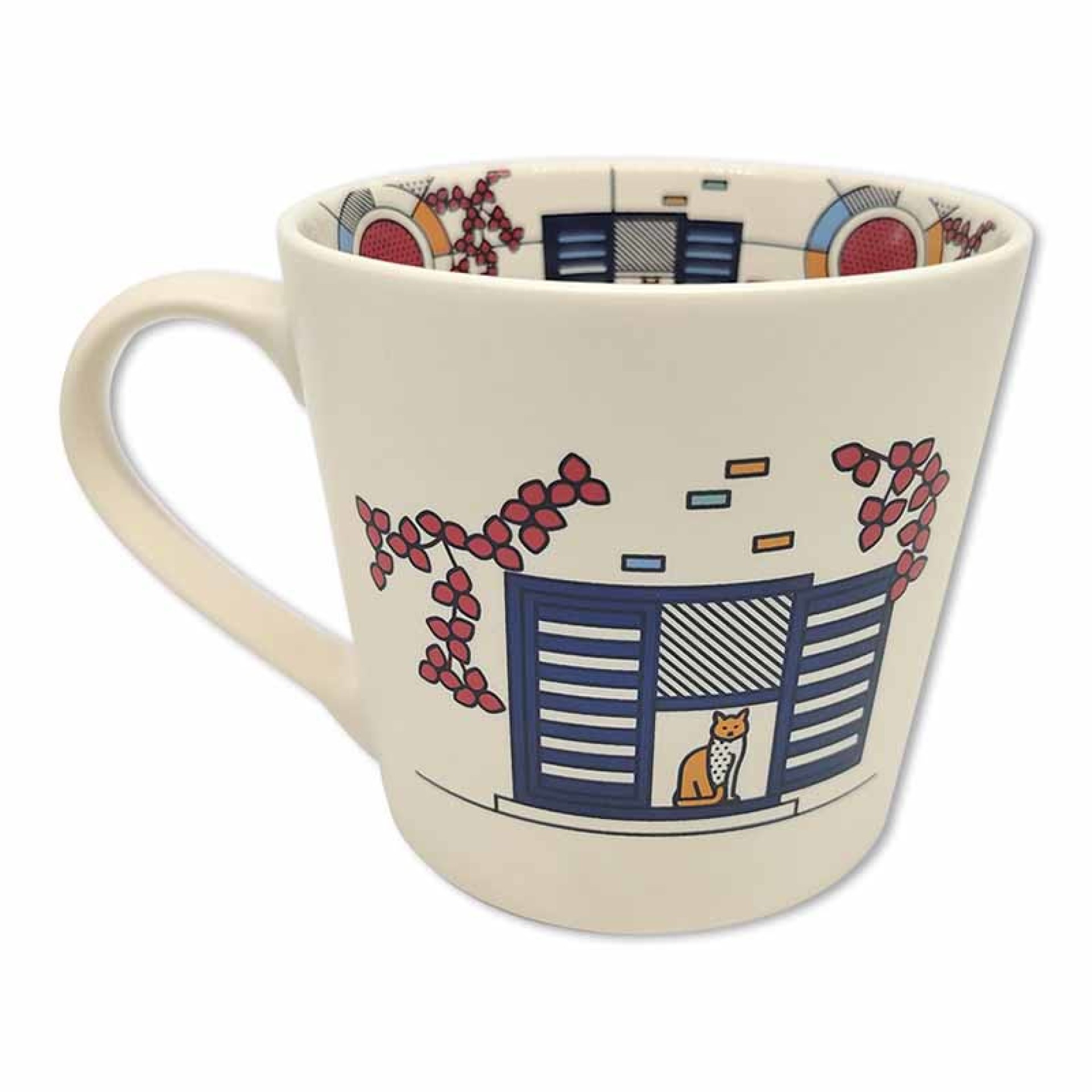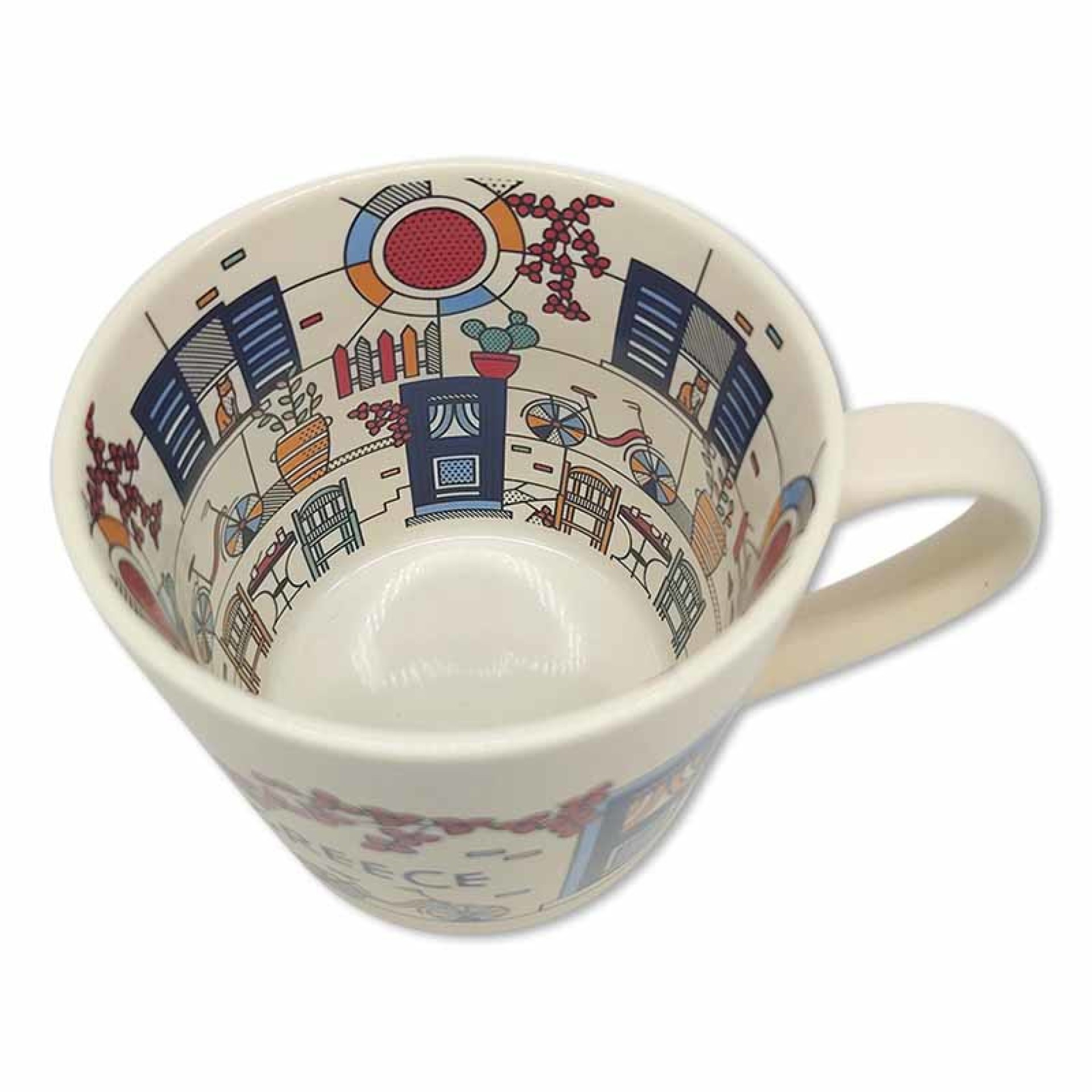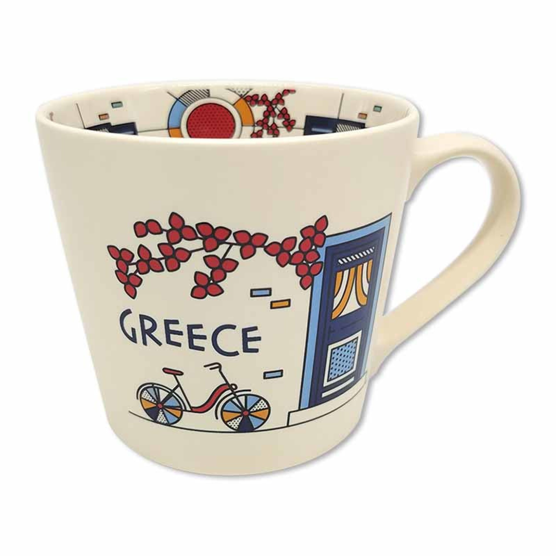 Η κεραμική κούπα GREECE Καφενείο & Ποδήλατο απεικονίζει ένα γραφικό ελληνικό καφενείο με παραθυρόφυλλα, ποδήλατο, λουλούδια και γάτες – όλα σε ένα μοντέρνο και ζωηρό σχέδιο.
