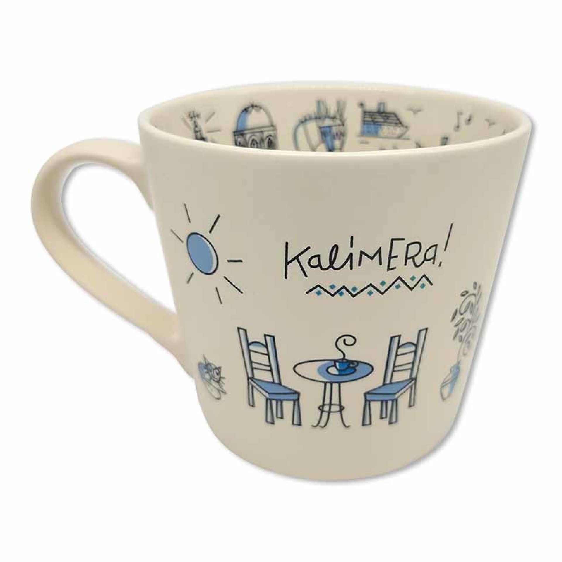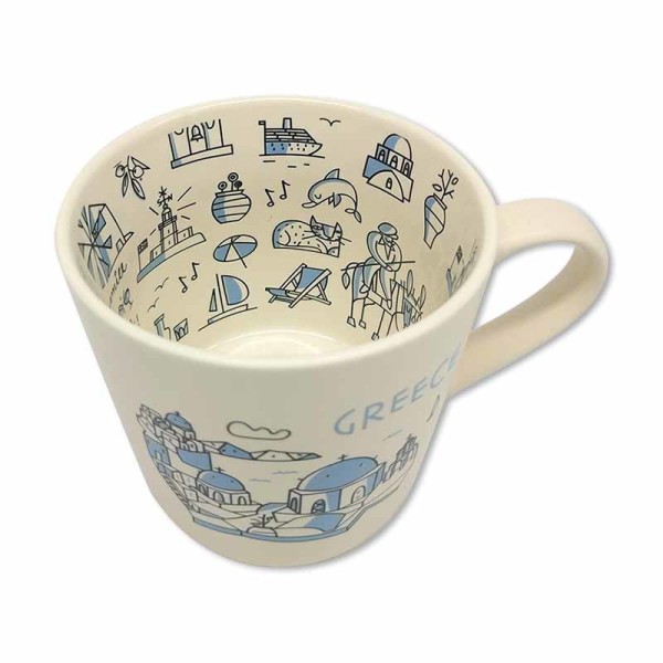 Η κεραμική κούπα GREECE “Kalimera!” Icons παρουσιάζει τα πιο αγαπημένα ελληνικά σύμβολα — τους μπλε τρούλους, τον ήλιο, το γαϊδουράκι, τις παραλίες και τα καφενεία.