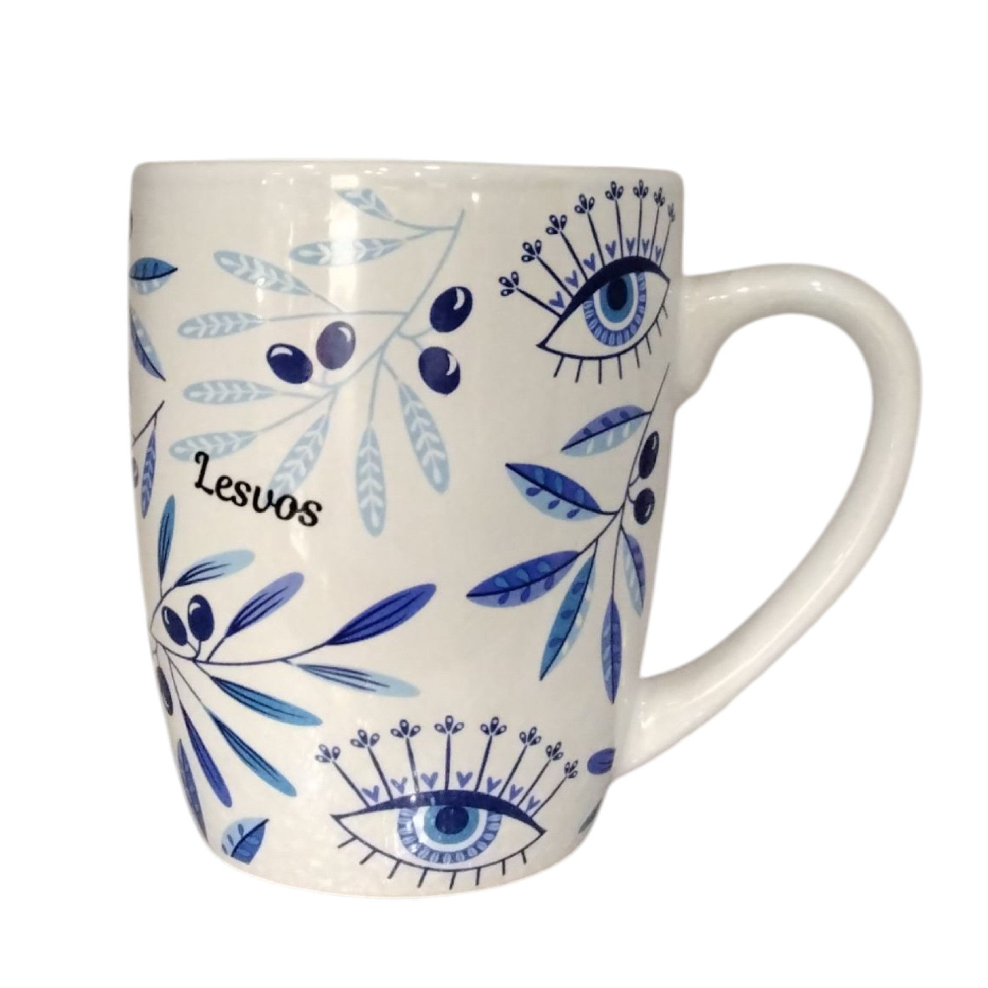 Κομψή κεραμική κούπα 320ml με πανέμορφο ελληνικό σχέδιο που συνδυάζει το κλασικό «μάτι» προστασίας και καλαίσθητα κλαδιά ελιάς σε μπλε αποχρώσεις. Ιδανική για καφέ, τσάι ή δώρο. Υψηλής ποιότητας κατασκευή, ανθεκτική στη χρήση και κατάλληλη για καθημερινή απόλαυση. Διαθέσιμη με επιγραφή “Greece” και “Lesvos”. Χωρητικότητα: 320 ml Υλικό: Κεραμικό