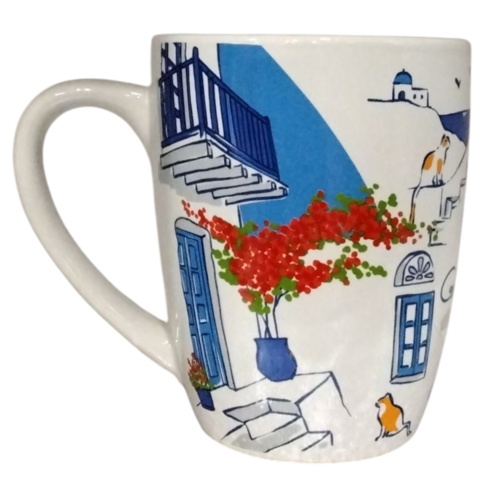 Κούπα πορσελάνης με υπέροχη εικονογράφηση ενός γραφικού ελληνικού σοκακιού, με μπλε πόρτες και παράθυρα, κατακόκκινες βουκαμβίλιες και παιχνιδιάρικες γάτες που κάθονται πάνω σε ποδήλατο και στα σκαλιά των σπιτιών. Το σχέδιο αποπνέει αυθεντική νησιώτικη γοητεία και ζεστή καλοκαιρινή ατμόσφαιρα. Ιδανική για καθημερινή χρήση ή ως μοναδικό souvenir από τη Λέσβο. Χαρακτηριστικά: Υλικό: Πορσελάνη Χωρητικότητα: 320 ml Σχέδιο με ποδήλατο, γάτες & ελληνικό νησιώτικο σοκάκι Κατάλληλη για ζεστά και κρύα ροφήματα Ιδανικό δώρο ή αναμνηστικό