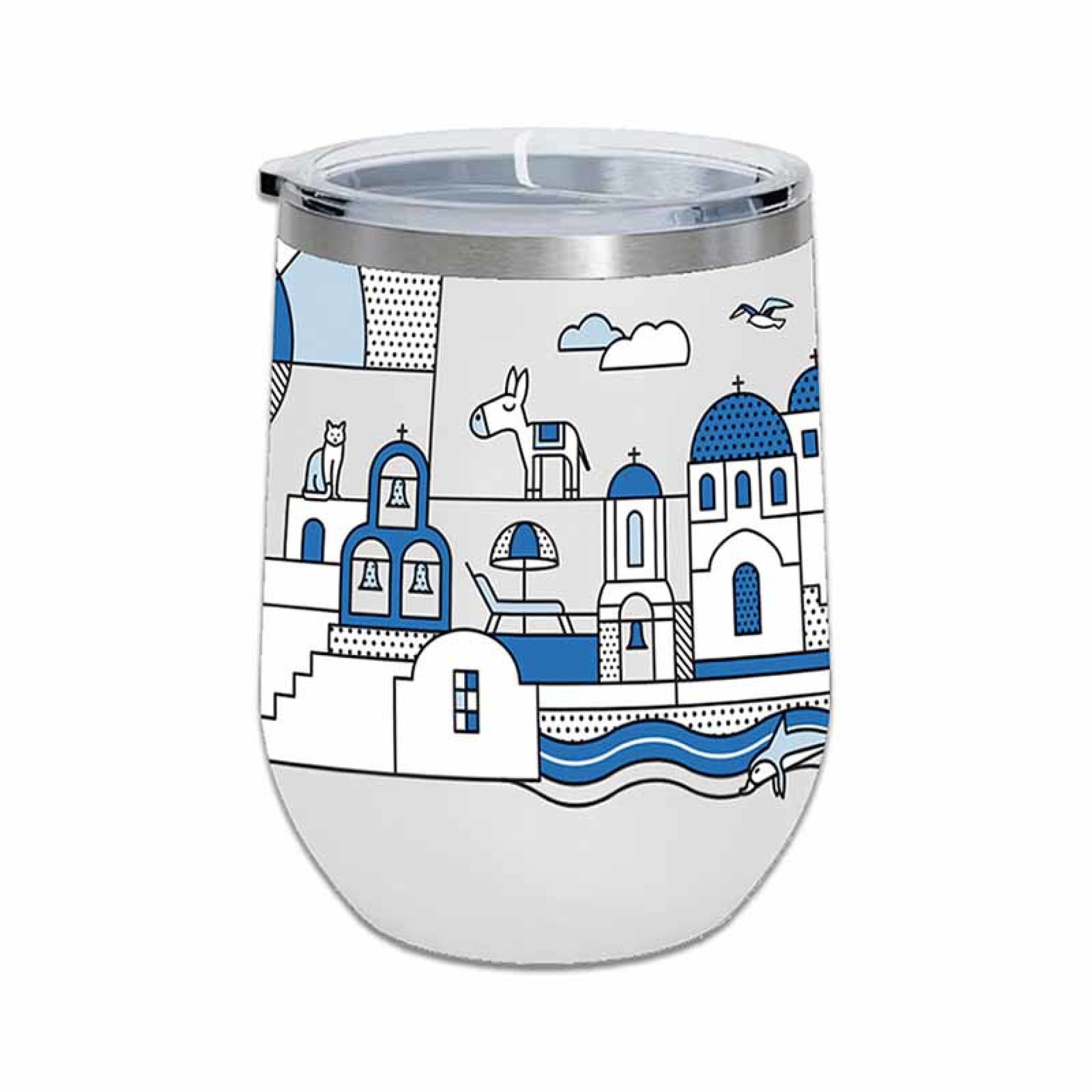 Το θερμό ποτήρι GREECE Μπλε Τρούλος αποτυπώνει τα λευκά σπίτια και τους χαρακτηριστικούς μπλε τρούλους των Κυκλάδων, μαζί με γαϊδουράκια, γάτες και το Αιγαίο πέλαγος.