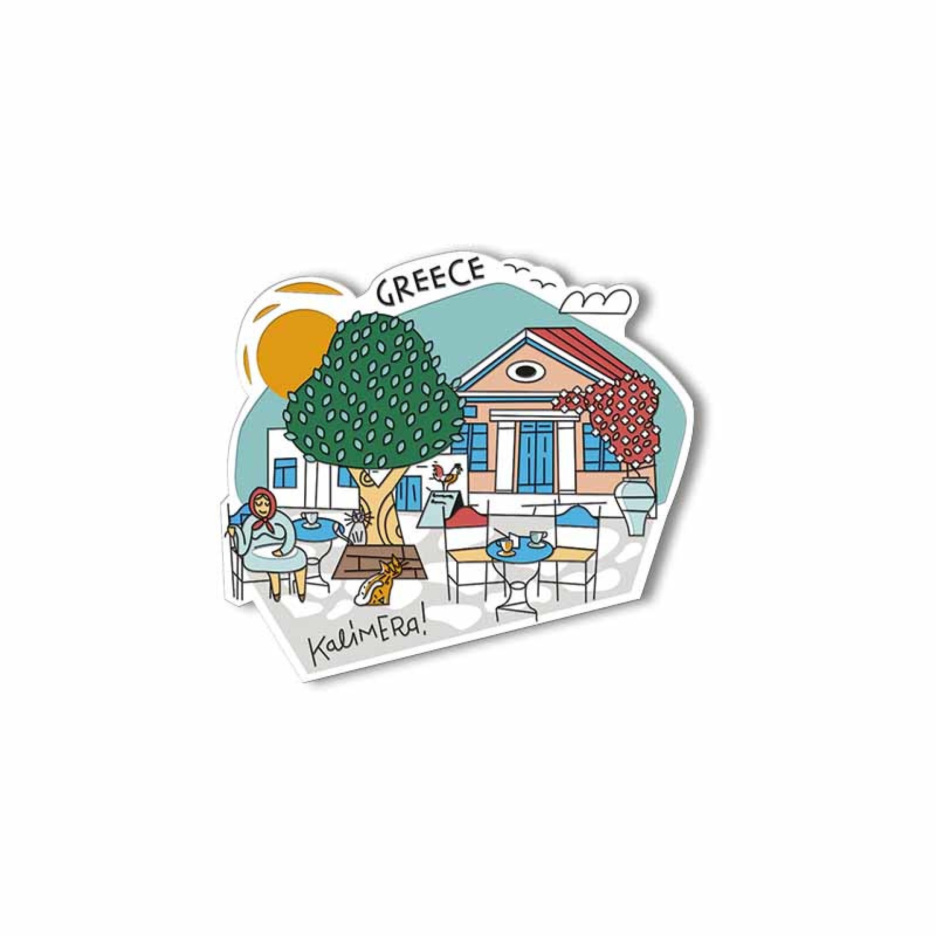 Μαγνήτης ψυγείου από πολυρητίνη με το σχέδιο “Kalimera” που απεικονίζει μια παραδοσιακή ελληνική αυλή με τη γιαγιά να απολαμβάνει τον καφέ της κάτω από τη σκιά ενός δέντρου. Ζεστά χρώματα, μπλε παράθυρα και λουλούδια δημιουργούν μια γνήσια εικόνα ελληνικής φιλοξενίας και ηρεμίας. Ένα όμορφο και νοσταλγικό αναμνηστικό από την Ελλάδα. Υλικό: Πολυρητίνη Διαστάσεις: περίπου 7 Χ 6 εκ. Χώρα προέλευσης: Ελλάδα