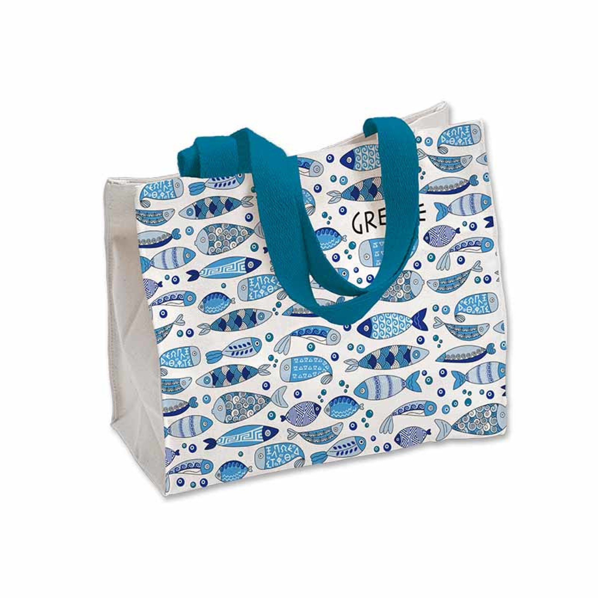 Μια τσάντα που μυρίζει θάλασσα και ελληνικό καλοκαίρι! Το μοτίβο με τα γαλάζια ψαράκια, ζωγραφισμένα με ελληνικά σχέδια και μοτίβα, αποτυπώνει τη δροσιά του Αιγαίου και τη χαλαρή διάθεση των νησιών. Το κάθε ψαράκι είναι μοναδικό, με λεπτομέρειες εμπνευσμένες από την ελληνική τέχνη, τη θάλασσα και την παράδοση. Από ανθεκτικό ύφασμα, με γαλάζιες χειρολαβές και ευρύχωρο εσωτερικό, είναι ιδανική για τη βόλτα, το ψώνισμα ή την παραλία. Μια χαρούμενη, φρέσκια και “θαλασσινή” τσάντα που φέρνει μαζί της το ελληνικό καλοκαίρι όπου κι αν βρεθείς! Διαστάσεις: 22 X 29 cm
