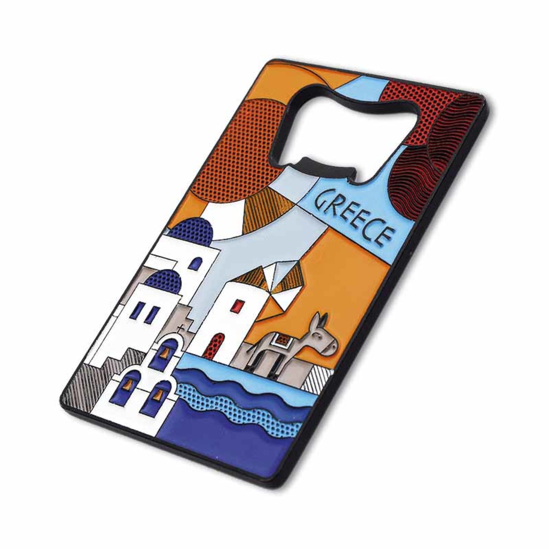 Εντυπωσιακό ανοιχτήρι μπουκαλιών με πολύχρωμο ανάγλυφο σχέδιο εμπνευσμένο από το μοναδικό μπλε του Αιγαίου και την κυκλαδίτικη αρχιτεκτονική. Λευκά σπίτια, μπλε τρούλοι, ανεμόμυλος και γαϊδουράκι δημιουργούν μια ζωντανή εικόνα ελληνικού νησιού με καλλιτεχνική pop αισθητική. Ένα κομψό και πρακτικό αναμνηστικό της Ελλάδας. Χαρακτηριστικά: Μεταλλική κατασκευή με ανάγλυφο design Pop art αισθητική με χρώματα Αιγαίου Ιδανικό δώρο & συλλεκτικό αναμνηστικό Διαστάσεις: 7 × 4 cm