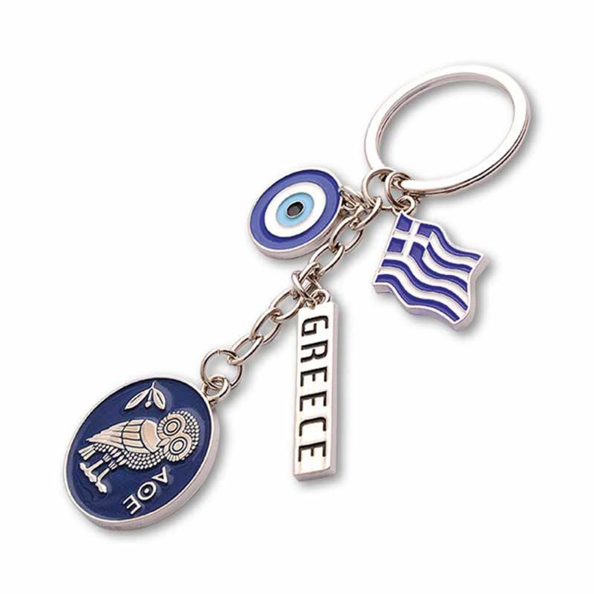 Κομψό μεταλλικό μπρελόκ με σύμβολα της ελληνικής παράδοσης: την αρχαία κουκουβάγια της Αθηνάς (σύμβολο σοφίας), το προστατευτικό μάτι και την ελληνική σημαία, μαζί με μεταλλική πλακέτα GREECE. Ένα ιδιαίτερο σουβενίρ που ενώνει ιστορία, τύχη και ελληνική ταυτότητα. Χαρακτηριστικά: Μεταλλική κατασκευή υψηλής ποιότητας Σμάλτο σε αποχρώσεις του μπλε Κουκουβάγια Αθηνάς – σύμβολο σοφίας Μάτι για προστασία & καλή τύχη Ελληνική σημαία & πλακέτα GREECE Διαστάσεις: περίπου 10 × 3 cm