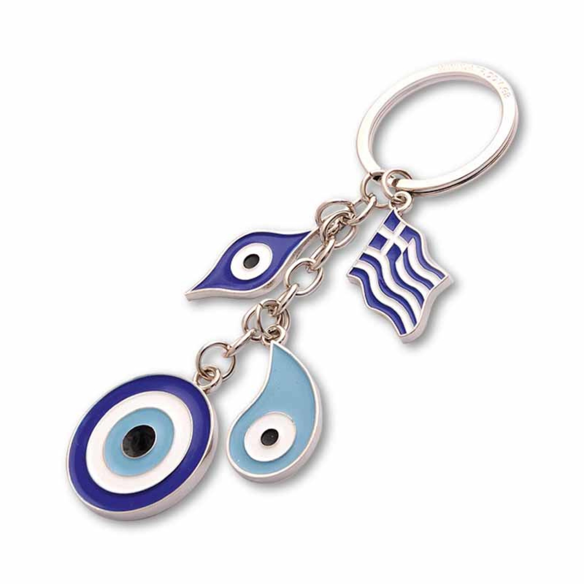 Κομψό μεταλλικό μπρελόκ με τέσσερα κρεμαστά στοιχεία: παραδοσιακά “μάτια” σε διαφορετικά σχέδια και αποχρώσεις του μπλε, καθώς και την ελληνική σημαία. Ένας όμορφος συνδυασμός συμβολισμών για προστασία από το κακό μάτι και έκφραση αγάπης για την Ελλάδα. Ιδανικό σουβενίρ ή δώρο για όσους αγαπούν τα ελληνικά σύμβολα. Χαρακτηριστικά: Ποιοτική μεταλλική κατασκευή Επισμάλτωση υψηλής αντοχής Κλασικός συμβολισμός "μάτι" προστασίας Ιδανικό για κλειδιά, τσάντες και δώρα Διαστάσεις: περίπου 10 × 3 cm