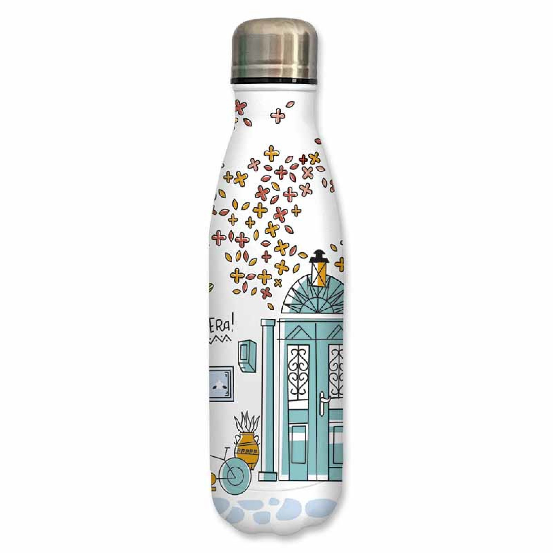 Το μπουκάλι θερμός GREECE Kafeneio είναι εμπνευσμένο από τις γωνιές των ελληνικών νησιών και τα παραδοσιακά καφενεία με τις γαλάζιες πόρτες και τις μπουκαμβίλιες. Το καλλιτεχνικό του σχέδιο συνδυάζει την ελληνική αρχιτεκτονική, τα ζεστά χρώματα και τη γαλήνια ατμόσφαιρα της μεσογειακής ζωής. Κατασκευασμένο από ανοξείδωτο ατσάλι διπλού τοιχώματος, διατηρεί τα ροφήματα ζεστά ή κρύα για πολλές ώρες, ενώ το καπάκι ασφαλείας εξασφαλίζει απόλυτη στεγανότητα. Ιδανικό για το γραφείο, το ταξίδι ή την παραλία. Χαρακτηριστικά: Υλικό: Ανοξείδωτος χάλυβας, διπλό τοίχωμα Χωρητικότητα: 500 ml Θερμομονωτική κατασκευή για διατήρηση θερμοκρασίας Καπάκι ασφαλείας χωρίς διαρροές Παραδοσιακό σχέδιο εμπνευσμένο από ελληνικό καφενείο Ελαφρύ και ανθεκτικό Δεν προτείνεται για πλυντήριο πιάτων Ιδανικό αναμνηστικό ή δώρο από την Ελλάδα