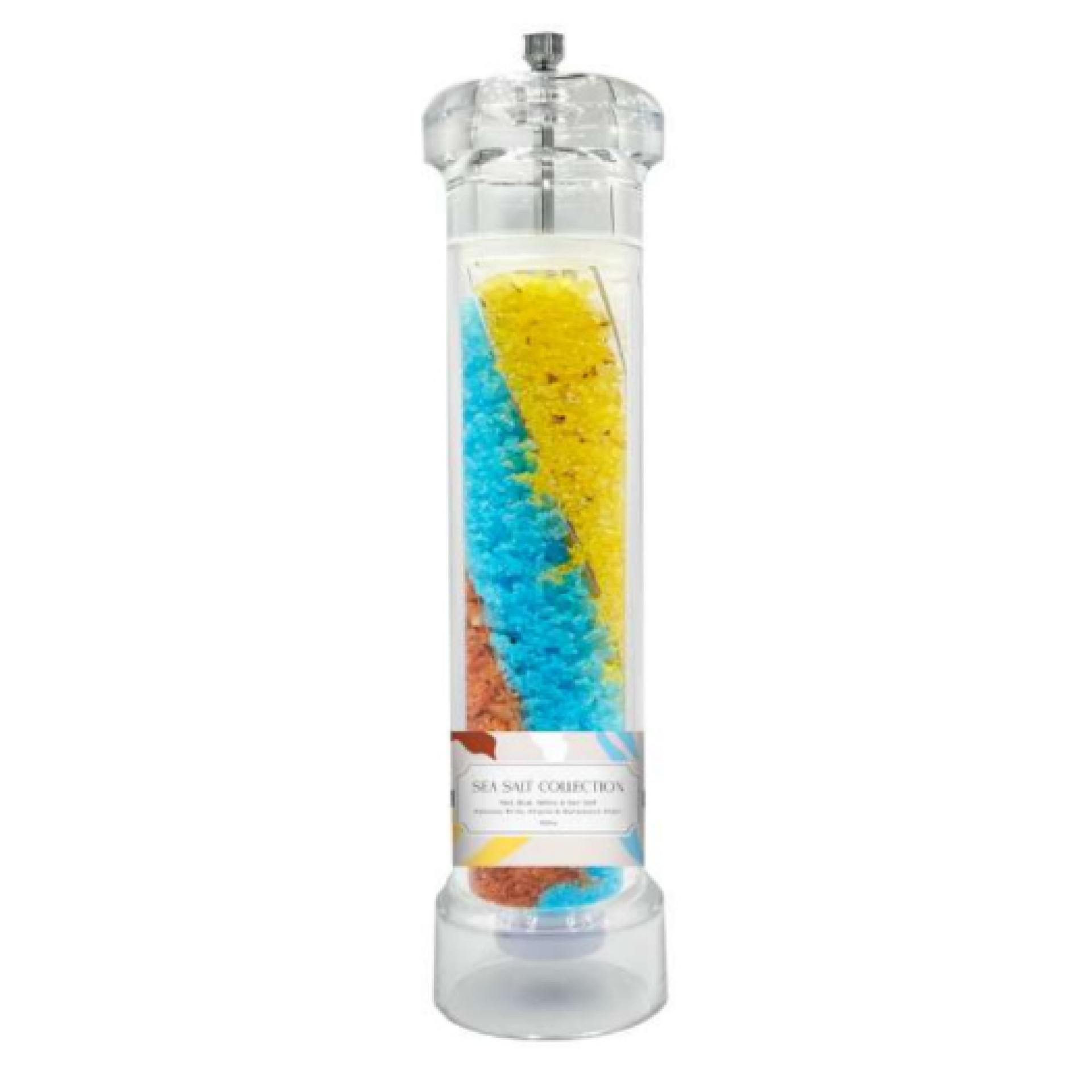 Εντυπωσιακός μύλος με πολύχρωμους κρυστάλλους θαλασσινού αλατιού σε μπλε, κίτρινη και ροζ απόχρωση. Μια ξεχωριστή προσθήκη για κάθε κουζίνα που συνδυάζει γεύση και αισθητική. Το μείγμα προσφέρει ήπια και ισορροπημένη αλμύρα, ιδανική για σαλάτες, ψητά, κρέας και ψάρι.