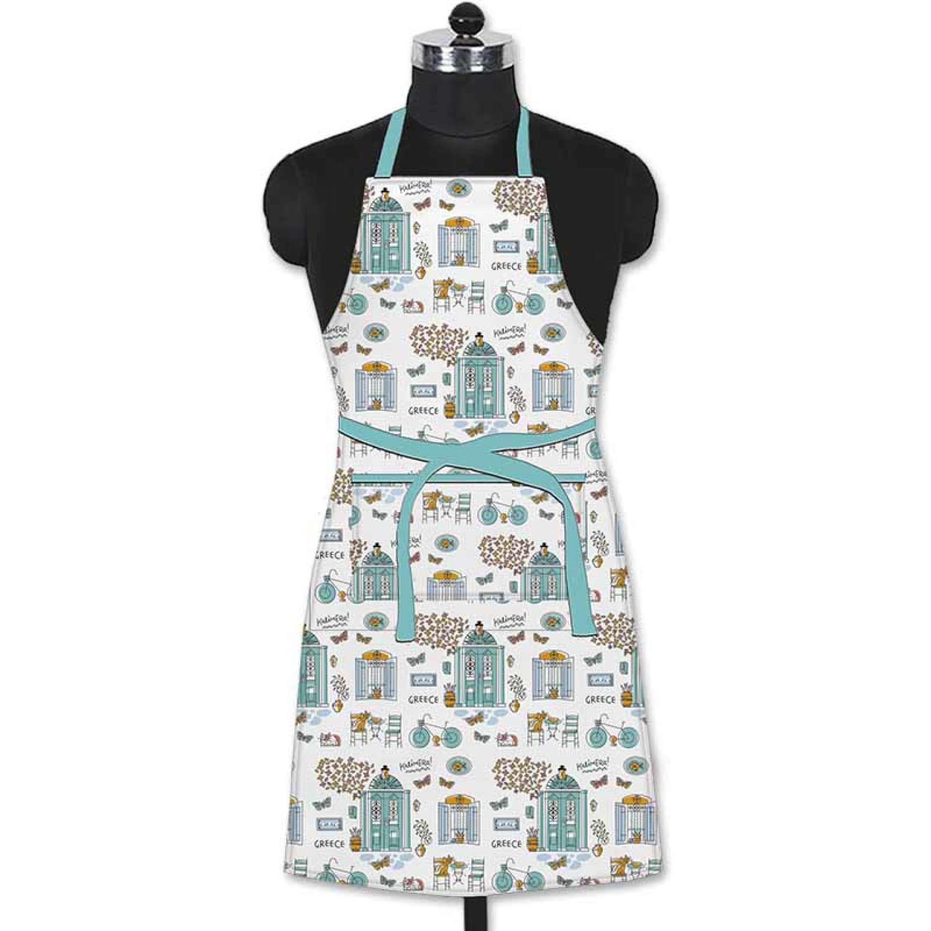 Η ποδιά “Καφενείο” αποπνέει τη γοητεία της παραδοσιακής Ελλάδας, εμπνευσμένη από τα καφενεία με τις χαρακτηριστικές μπλε πόρτες, τα τραπεζάκια με τις καρέκλες και τις γάτες στο παράθυρο.