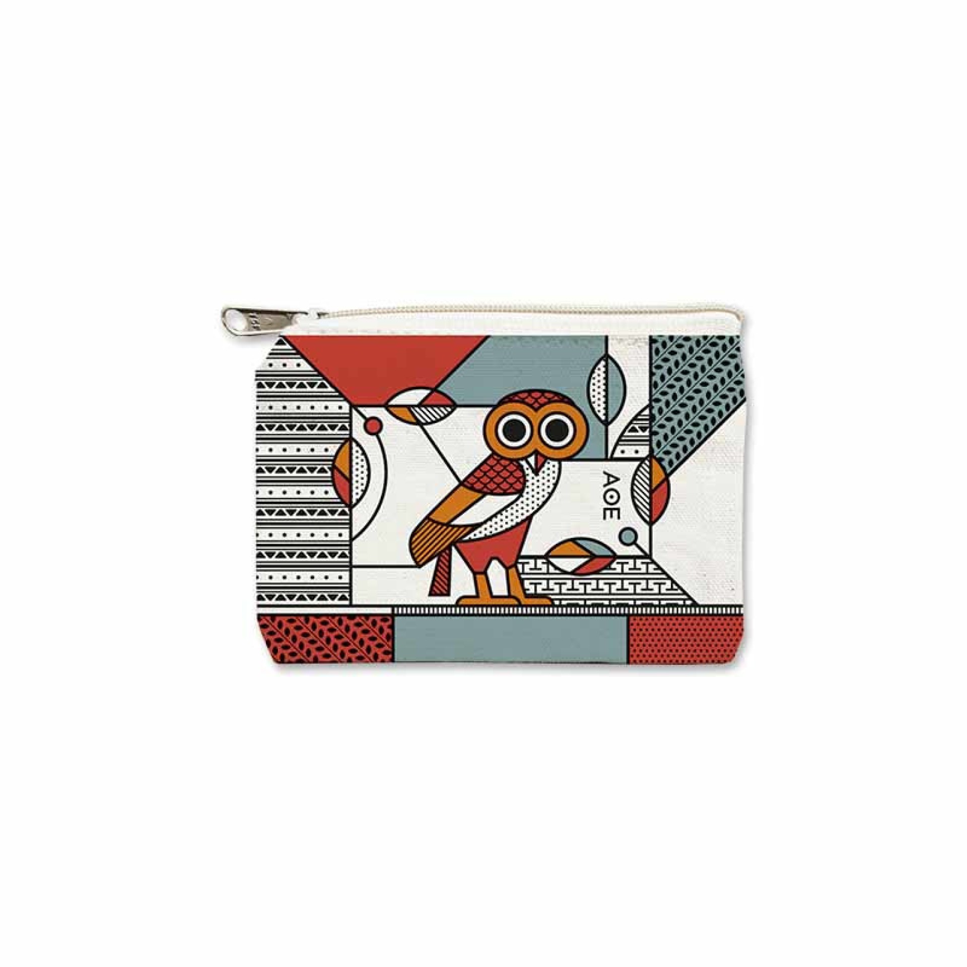 Ένα εντυπωσιακό πορτοφολάκι εμπνευσμένο από τα αρχαία ελληνικά σύμβολα της σοφίας και της γνώσης. Η κουκουβάγια, ιερό πτηνό της θεάς Αθηνάς, αποδίδεται σε σύγχρονο γεωμετρικό ύφος με γήινους τόνους και διακοσμητικά μοτίβα. Το αποτέλεσμα είναι μια καλλιτεχνική ένωση παράδοσης και μοντερνισμού. Ένα ιδιαίτερο μικρό αξεσουάρ με βαθιά ελληνική ψυχή. Διαστάσεις: 10.5 Χ 15.5 cm