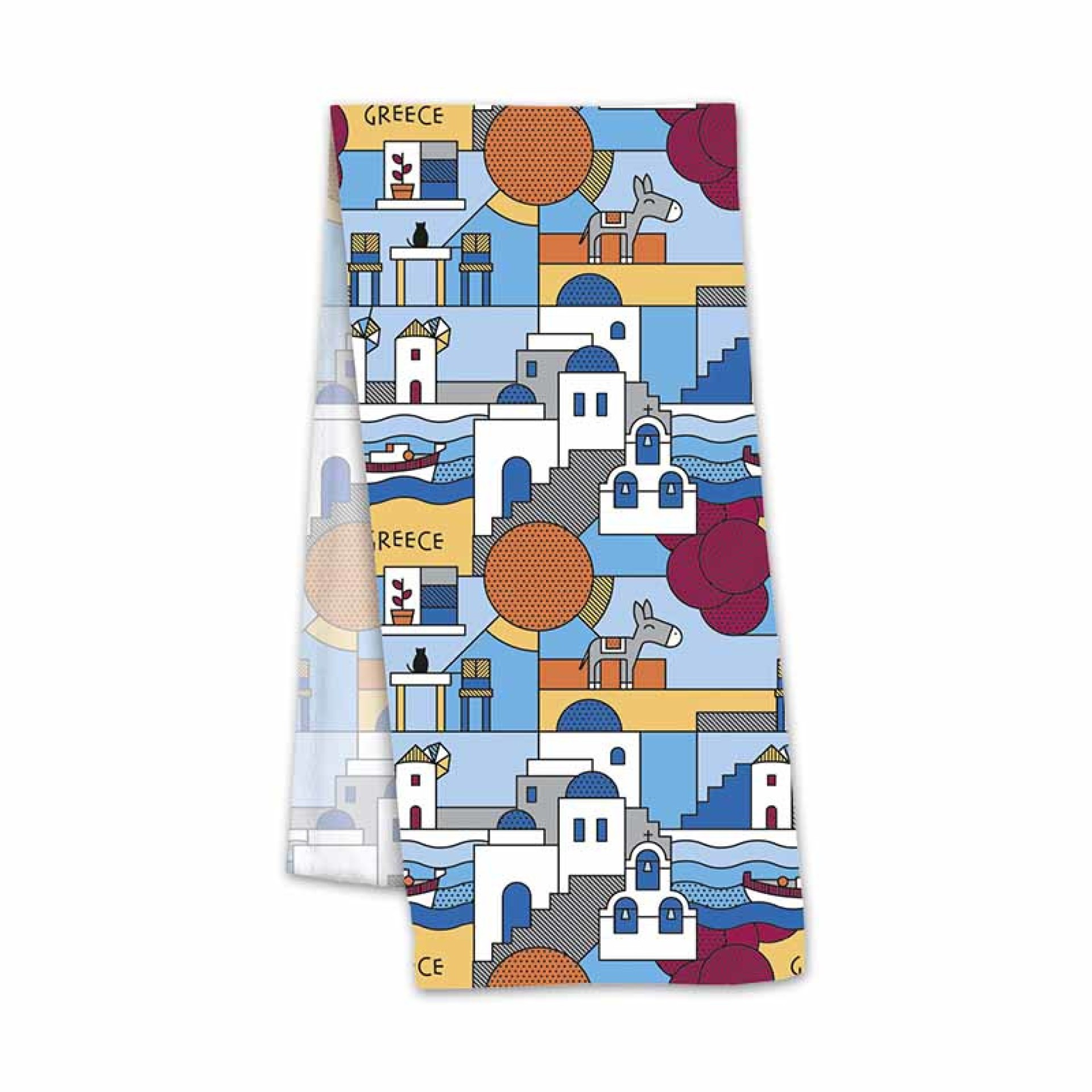 Η πετσέτα κουζίνας “Μπλε του Αιγαίου” αποτυπώνει τη γοητεία των ελληνικών νησιών μέσα από γεωμετρικά σχέδια και έντονα, χαρούμενα χρώματα.
