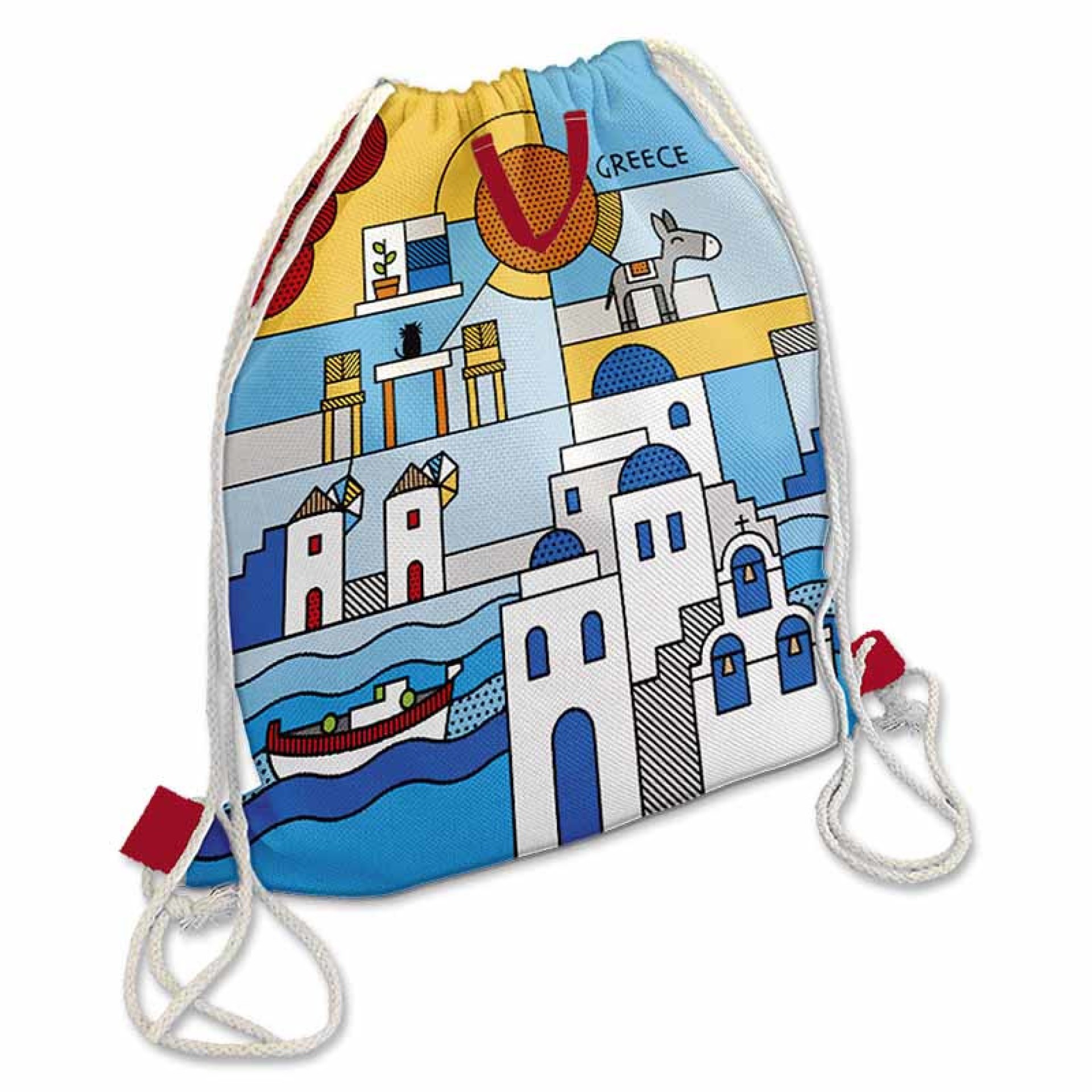 Ένα σακίδιο γεμάτο καλοκαίρι, φως και Ελλάδα! Το σχέδιο αποτυπώνει τη μαγεία των ελληνικών νησιών — τα λευκά κυκλαδίτικα σπίτια με τα μπλε παράθυρα, τον ήλιο, τη θάλασσα και τα γραφικά σοκάκια που όλοι αγαπούν. Η μοντέρνα γεωμετρική σύνθεση και τα φωτεινά χρώματα χαρίζουν στο σχέδιο έναν καλλιτεχνικό χαρακτήρα, συνδυάζοντας παράδοση και σύγχρονο design. Κατασκευασμένο από ανθεκτικά υλικά, με ρυθμιζόμενα κορδόνια και ευρύχωρο εσωτερικό, είναι ιδανικό για ταξίδια, εκδρομές, παραλία ή καθημερινή χρήση. Ένα πρακτικό και καλαίσθητο σακίδιο που φέρνει μαζί του τον ήλιο και τη χαρά του ελληνικού καλοκαιριού! Διαστάσεις: 42 X 37 cm