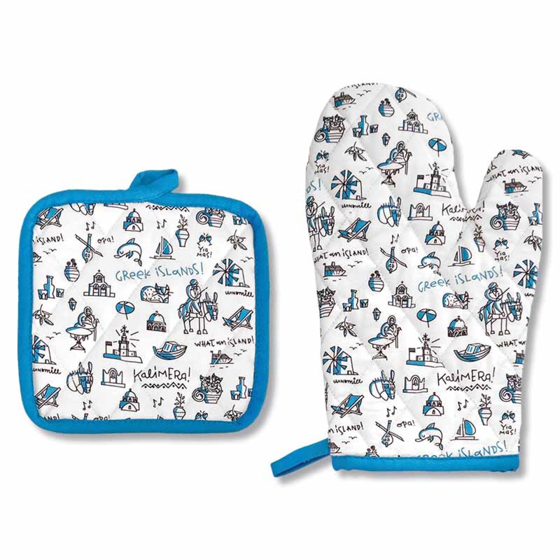 Σετ Γάντι Κουζίνας & Πιάστρα “Ελληνικά Νησιά” Φέρτε την αύρα του ελληνικού καλοκαιριού στην κουζίνα σας με αυτό το υπέροχο σετ! Το σχέδιο είναι εμπνευσμένο από τα ελληνικά νησιά και περιλαμβάνει χαρακτηριστικά μοτίβα όπως ανεμόμυλους, εκκλησάκια, γαϊδουράκια, δελφίνια και τη λέξη “Kalimera!”. Το σετ περιλαμβάνει: Γάντι φούρνου: 26,5 × 16,8 cm Πιάστρα: 18 × 18 cm Ιδανικό για καθημερινή χρήση ή ως αναμνηστικό δώρο με ελληνική ταυτότητα. Ανθεκτικό στη θερμότητα, με βαμβακερή επένδυση και περιμετρικό ρέλι σε μπλε χρώμα. Υλικό: 100% βαμβάκι με θερμομονωτική επίστρωση Σχέδιο: Ελληνικά Νησιά Σετ 2 τεμαχίων