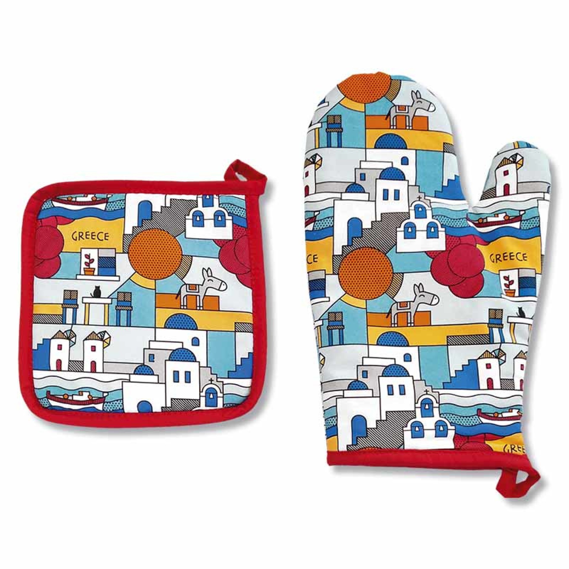 Σετ Γάντι Κουζίνας & Πιάστρα “Μπλε του Αιγαίου” Ένα εντυπωσιακό σετ κουζίνας με σχέδιο εμπνευσμένο από τα ελληνικά νησιά! Το γεωμετρικό μοτίβο περιλαμβάνει χαρακτηριστικά στοιχεία όπως λευκά σπιτάκια με μπλε τρούλους, γαϊδουράκια, καράβια και έντονους ήλιους, σε φωτεινά χρώματα κόκκινου, μπλε, πορτοκαλί και κίτρινου. Το σετ περιλαμβάνει: Γάντι φούρνου: 26,5 × 16,8 cm Πιάστρα: 18 × 18 cm Πρακτικό, ανθεκτικό και καλαίσθητο, αποτελεί ιδανική επιλογή για κάθε κουζίνα ή ως αναμνηστικό δώρο από την Ελλάδα. Ανθεκτικό στη θερμότητα, με βαμβακερή επένδυση και κόκκινο περιμετρικό ρέλι. Υλικό: 100% βαμβάκι με θερμομονωτική επίστρωση Σχέδιο: Μπλε του Αιγαίου Σετ 2 τεμαχίων