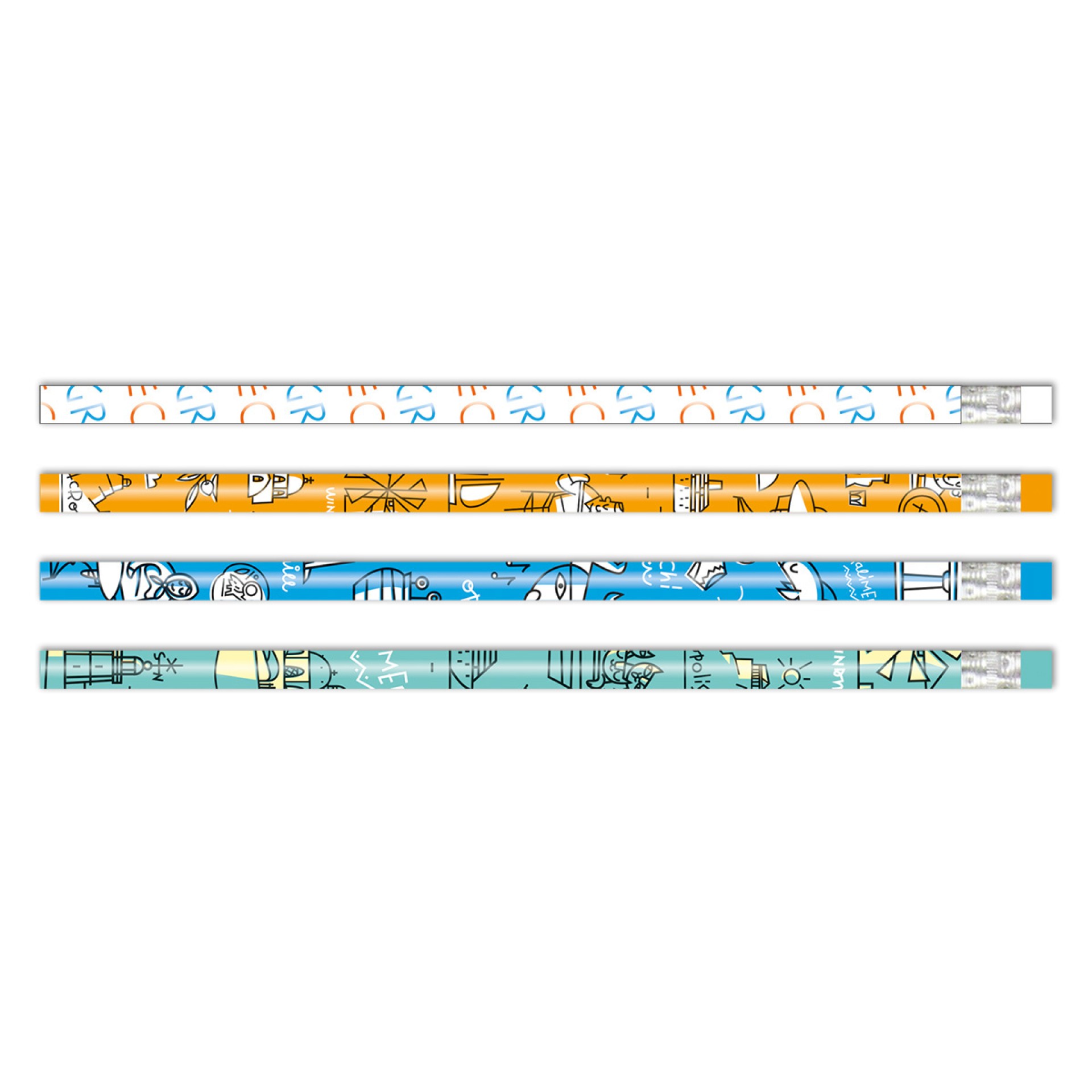Κάθε μολύβι είναι διακοσμημένο με διαφορετικά μοτίβα εμπνευσμένα από τη ζωή και την αισθητική των ελληνικών νησιών — ανεμόμυλους, εκκλησάκια, θάλασσα, γάτες και παραδοσιακά στοιχεία.