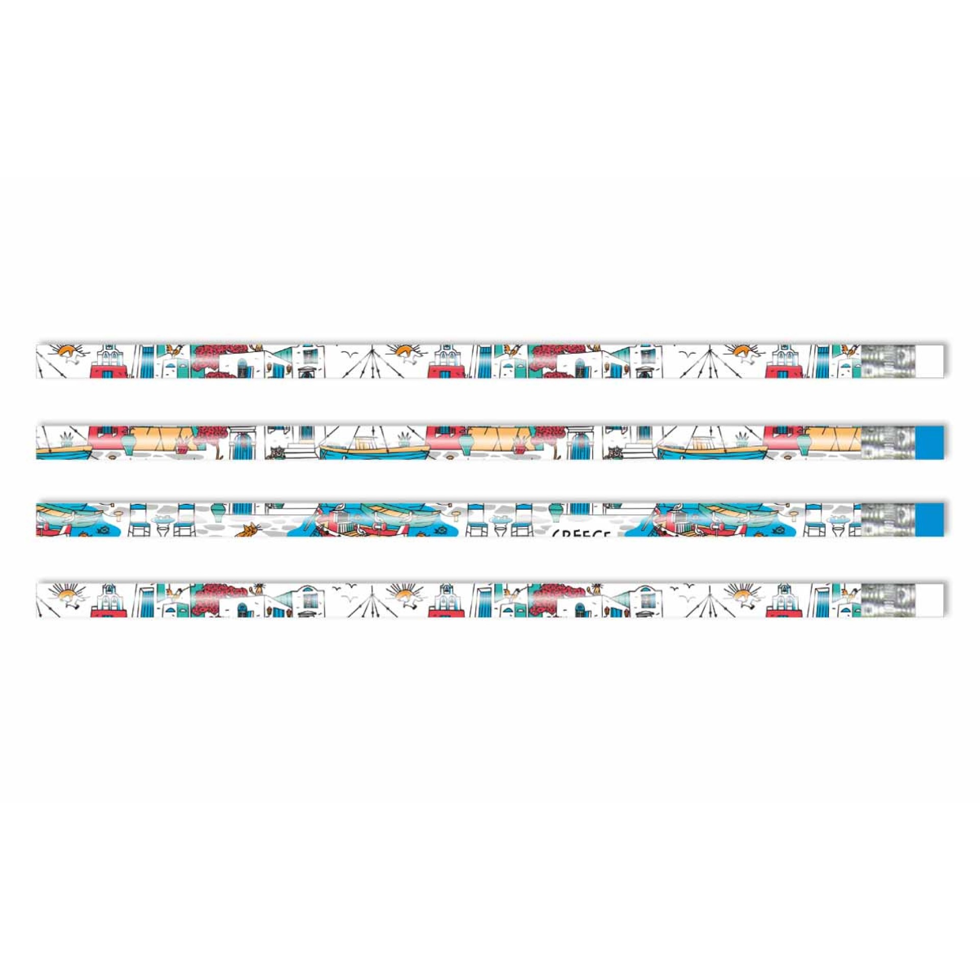 Κάθε μολύβι είναι διακοσμημένο με πολύχρωμα σχέδια που απεικονίζουν γραφικά λιμανάκια, καΐκια, ανεμόμυλους και λευκά σπίτια, αποπνέοντας καλοκαιρινή αύρα και ελληνική γαλήνη.