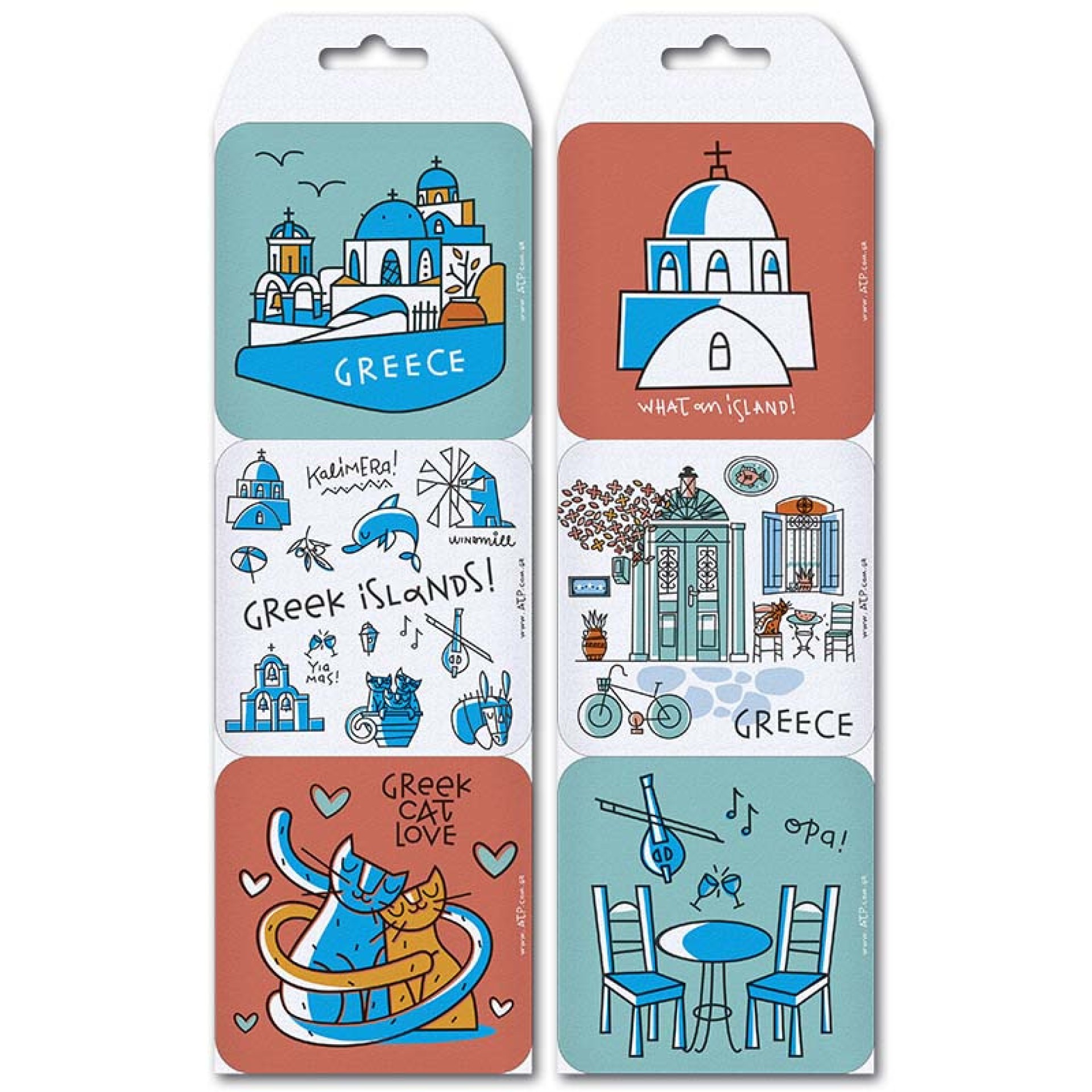 Ένα χαρούμενο και παιχνιδιάρικο σετ σουβέρ με εικονογραφήσεις που αποτυπώνουν την ομορφιά και τον χαρακτήρα των ελληνικών νησιών! Μπλε τρούλοι, ταβερνάκια, γάτες, μουσική και καλοκαιρινή διάθεση — όλα σε ένα όμορφο πακέτο.