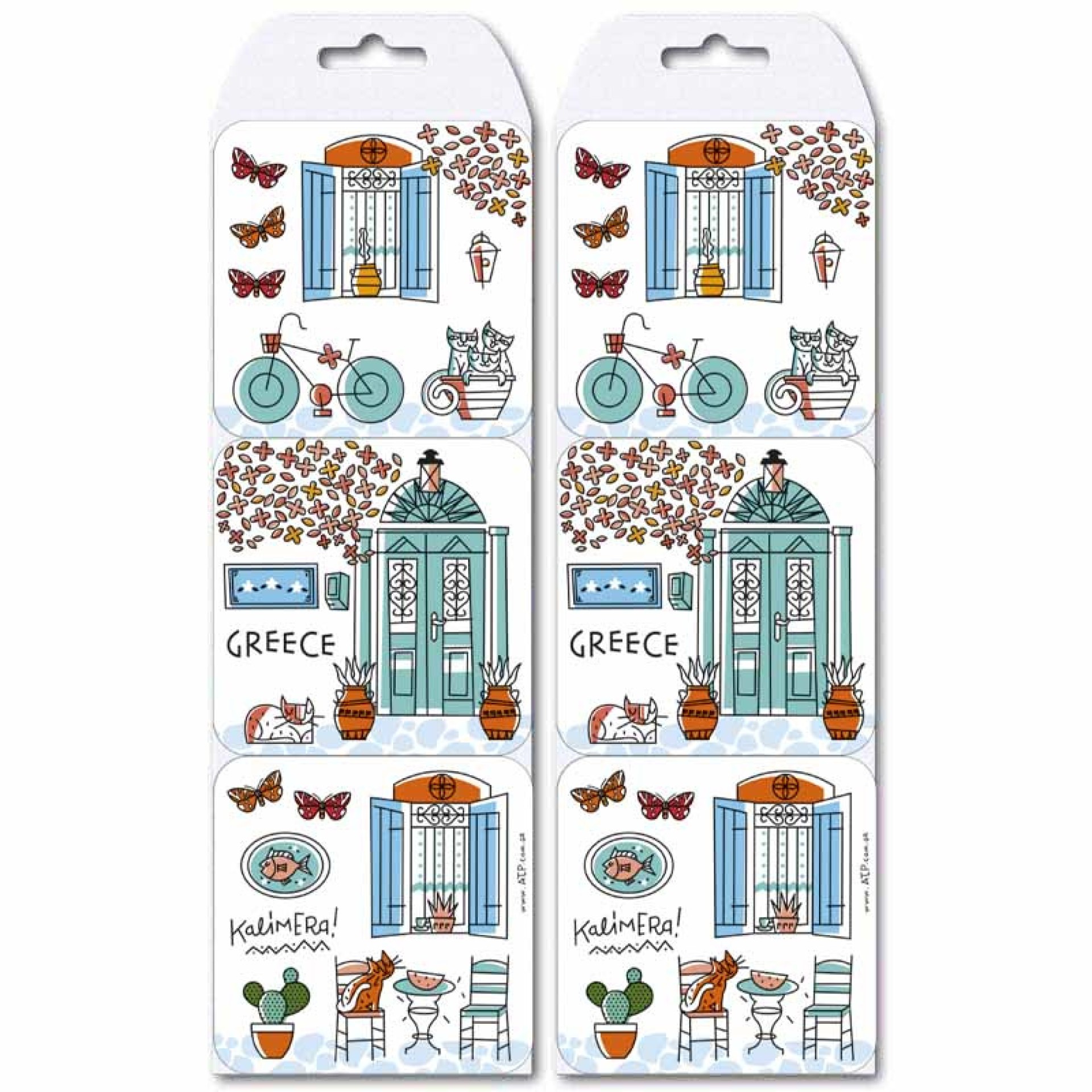 Σουβέρ εμπνευσμένα από την αυθεντική ελληνική καθημερινότητα: παλιά παράθυρα, γατούλες, ποδήλατα, φυτά, παραδοσιακές πόρτες και μικρά καφέ. Πολύχρωμο και χαριτωμένο σχέδιο που αποτυπώνει την χαλαρή, ζεστή ατμόσφαιρα των ελληνικών γειτονιών.