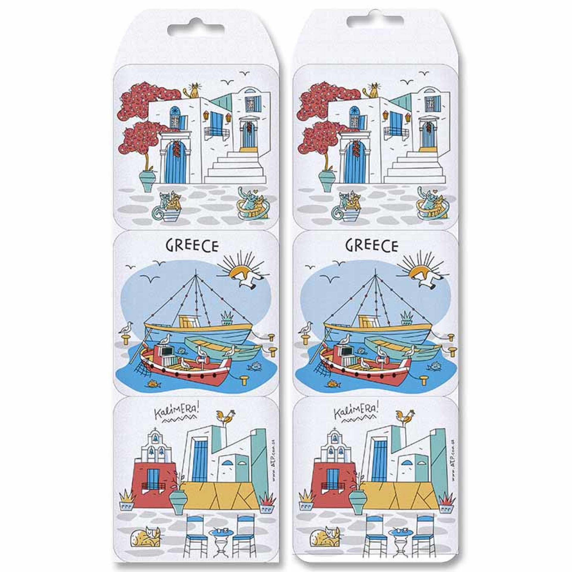 Σουβέρ με χαριτωμένες απεικονίσεις από τα ελληνικά νησιά: ασπρογάλανα σπίτια, γάτες στα σοκάκια, ανθισμένες βουκαμβίλιες και παραδοσιακά καΐκια στο λιμάνι. Ζωντανό και φωτεινό σχέδιο που φέρνει το καλοκαίρι στο τραπέζι σας όλο τον χρόνο!