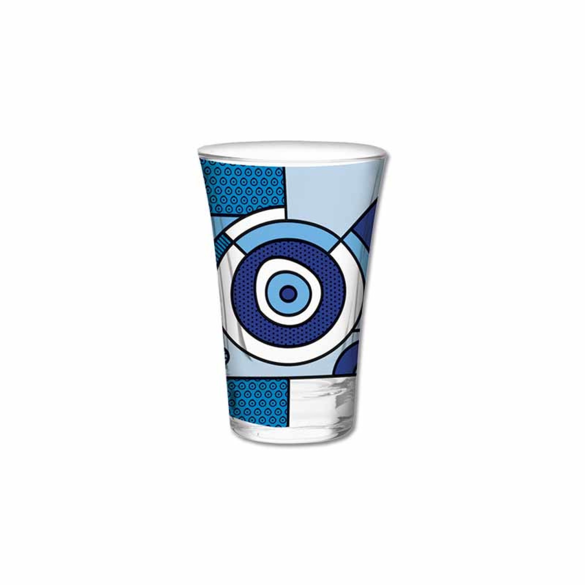 Γυάλινο ποτηράκι σφηνάκι (shot glass) με μοντέρνο σχέδιο “Μάτια”, εμπνευσμένο από το παραδοσιακό ελληνικό φυλαχτό. Ο γεωμετρικός σχεδιασμός και οι αποχρώσεις του μπλε συνδυάζουν την ελληνική παράδοση με σύγχρονη αισθητική, δημιουργώντας ένα κομψό αναμνηστικό ή δώρο. Υλικό: Γυαλί Χωρητικότητα: περίπου 60 ml Χώρα προέλευσης: Ελλάδα