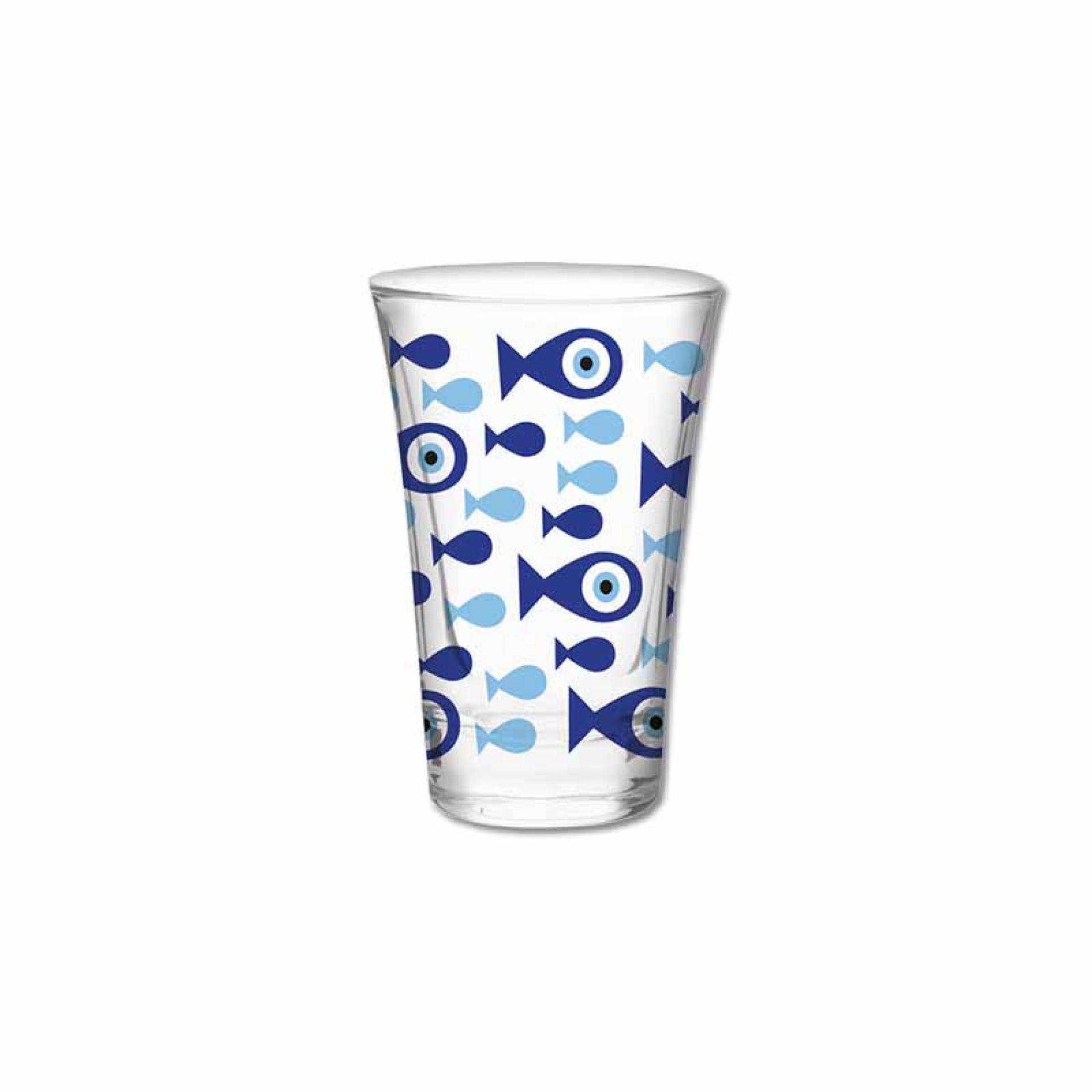 Γυάλινο ποτηράκι σφηνάκι (shot glass) με χαρούμενο σχέδιο “Ψάρια & Μάτια”, εμπνευσμένο από τη θάλασσα και το παραδοσιακό ελληνικό φυλαχτό. Ένα πολύχρωμο και συμβολικό αναμνηστικό που αποπνέει καλοκαιρινή διάθεση και ελληνική ενέργεια. Υλικό: Γυαλί Χωρητικότητα: περίπου 60 ml Χώρα προέλευσης: Ελλάδα