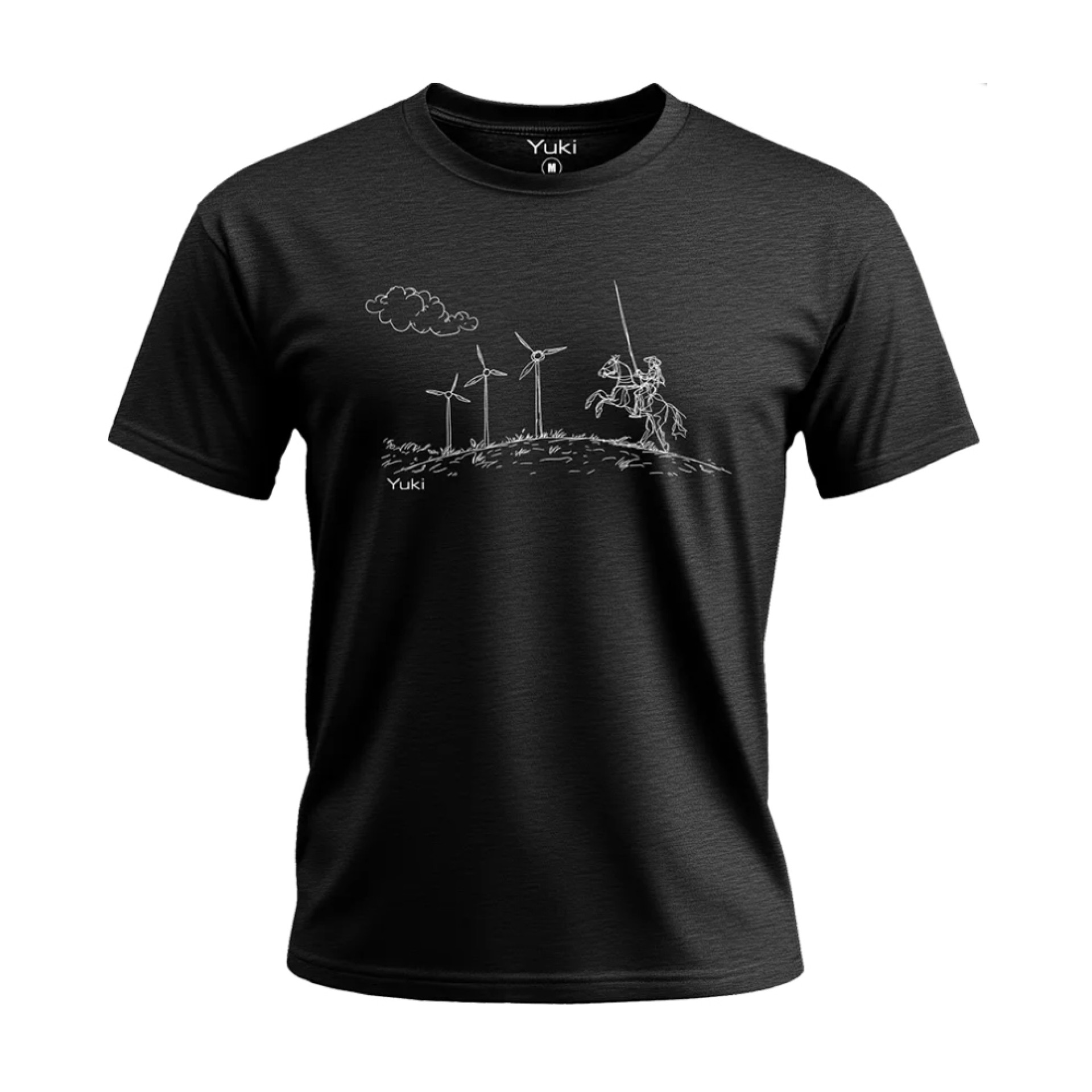 Ανδρικό κοντομάνικο μπλουζάκι Yuki σε μαύρο χρώμα με minimal σχέδιο εμπνευσμένο από τον Δον Κιχώτη. Ο ιππότης πάνω στο άλογο αντιμετωπίζει ανεμογεννήτριες, σε μια σύγχρονη εκδοχή του κλασικού συμβολισμού. Ένα καλλιτεχνικό μπλουζάκι που συνδυάζει φαντασία, λογοτεχνική αναφορά και μοντέρνο στυλ. Χαρακτηριστικά: Υλικό: 100% βαμβάκι Χρώμα: Μαύρο Σχέδιο: Δον Κιχώτης και ανεμογεννήτριες Κανονική γραμμή Διαθέσιμα μεγέθη: S, M, L, XL, XXL