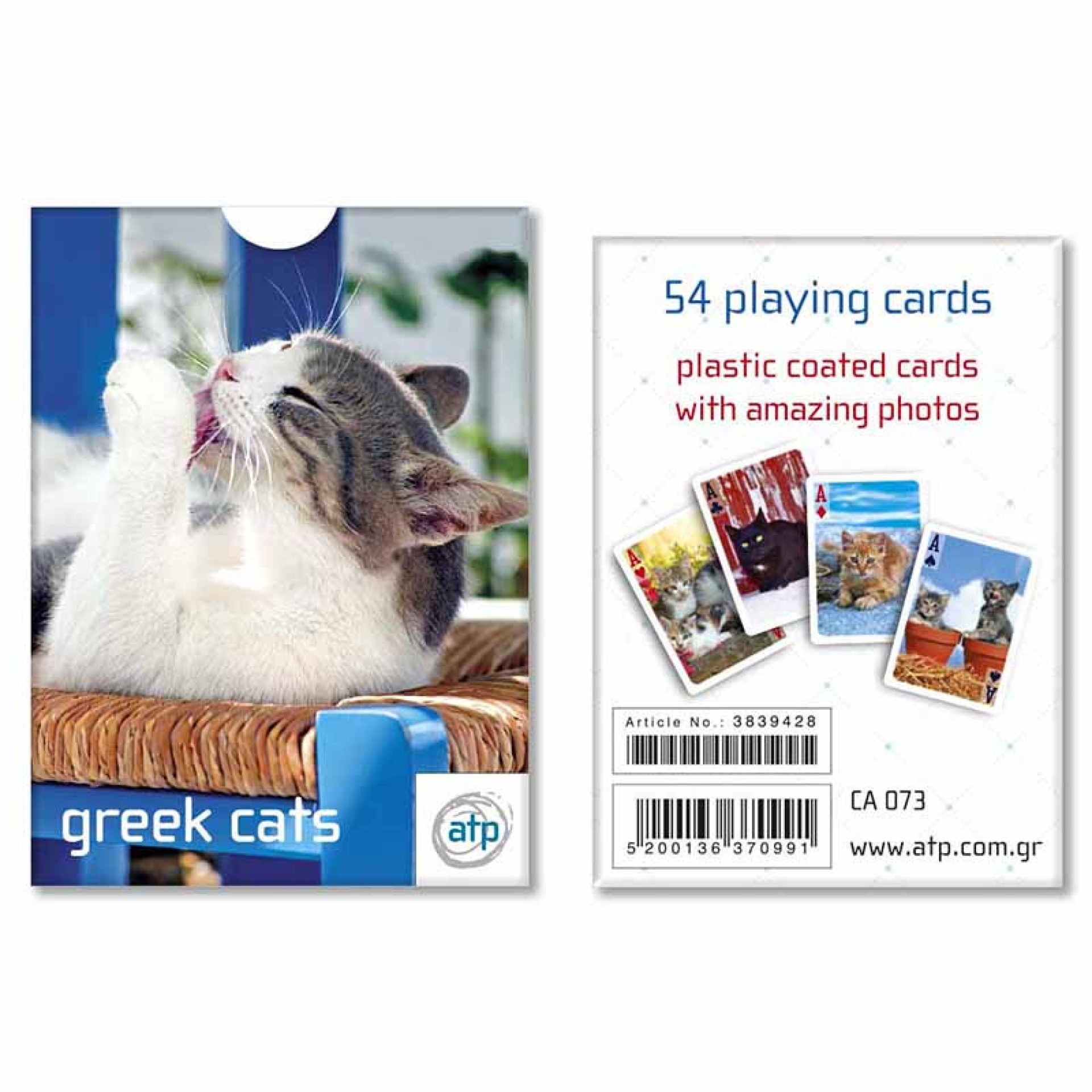 Τράπουλα 54 φύλλων με υπέροχες φωτογραφίες από γάτες της Ελλάδας, εμπνευσμένες από τις γραφικές γειτονιές και την παραδοσιακή νησιώτικη ατμόσφαιρα. Πλαστικοποιημένες κάρτες για μεγαλύτερη αντοχή και ευχάριστο παιχνίδι. Ιδανική για λάτρεις των γατών, συλλέκτες και όσους αγαπούν την Ελλάδα. Υπέροχη επιλογή για δώρο ή ως αναμνηστικό.