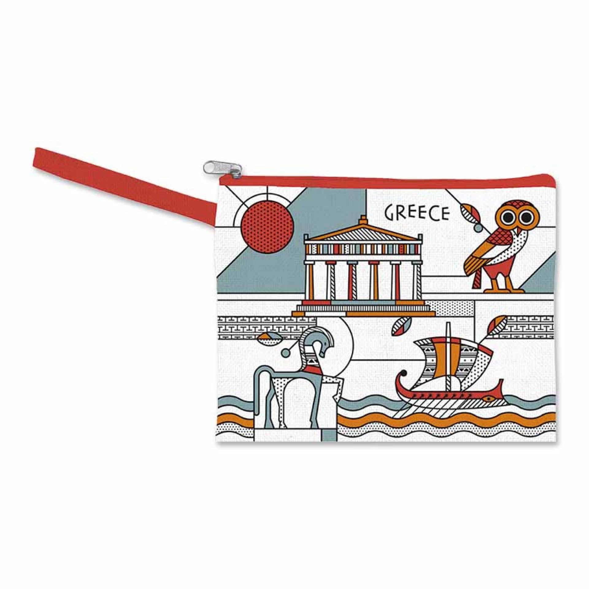 Ένα εντυπωσιακό νεσεσέρ που αφηγείται την ιστορία της αρχαίας Ελλάδας μέσα από σύγχρονη γραφιστική ματιά! Το σχέδιο περιλαμβάνει κλασικά ελληνικά σύμβολα — τον Παρθενώνα, την κουκουβάγια της θεάς Αθηνάς, την τριήρη και τον Δούρειο Ίππο — αποτυπωμένα σε μοντέρνες γραμμές και χρώματα εμπνευσμένα από την κεραμική τέχνη. Κατασκευασμένο από ανθεκτικά υλικά, με στιβαρό φερμουάρ και πρακτικό λουράκι, αποτελεί το ιδανικό αξεσουάρ για ταξίδια, καλλυντικά ή καθημερινή χρήση. Ένα μοναδικό σουβενίρ που ενώνει την παράδοση με το μοντέρνο design — για όσους αγαπούν την Ελλάδα και την ιστορία της. Διαστάσεις: 19 Χ 24 cm