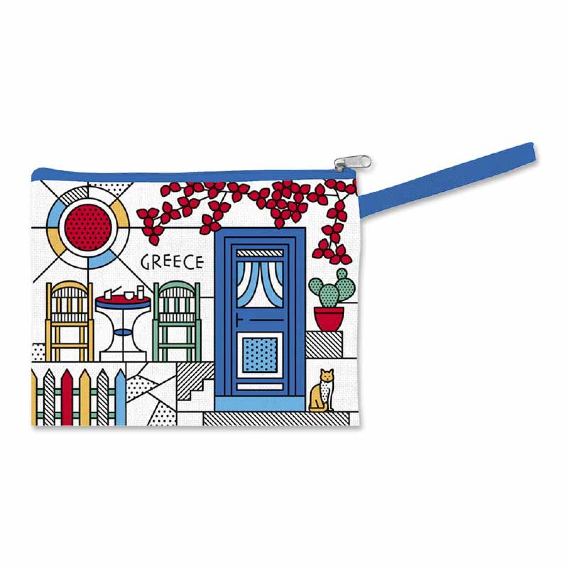 Ένα νεσεσέρ που αποπνέει την αυθεντική γοητεία της Ελλάδας! Το σχέδιο, με τα χαρακτηριστικά γαλάζια παράθυρα και πόρτα, το ποδήλατο, τη γάτα στο περβάζι και τα κατακόκκινα λουλούδια, αποτυπώνει τη ζεστασιά και τη ρομαντική ατμόσφαιρα των ελληνικών νησιών. Η καθαρή γεωμετρία, τα φωτεινά χρώματα και οι μικρές λεπτομέρειες μετατρέπουν αυτό το νεσεσέρ σε ένα κομμάτι ελληνικής τέχνης. Φτιαγμένο από ποιοτικά, ανθεκτικά υλικά με ασφαλές φερμουάρ και πρακτικό λουράκι, είναι ιδανικό για ταξίδια, την παραλία ή την καθημερινή σου τσάντα. Ένα αξεσουάρ που αποπνέει φως, χαρά και την αληθινή “ψυχή” της Ελλάδας! Διαστάσεις: 19 Χ 24 cm