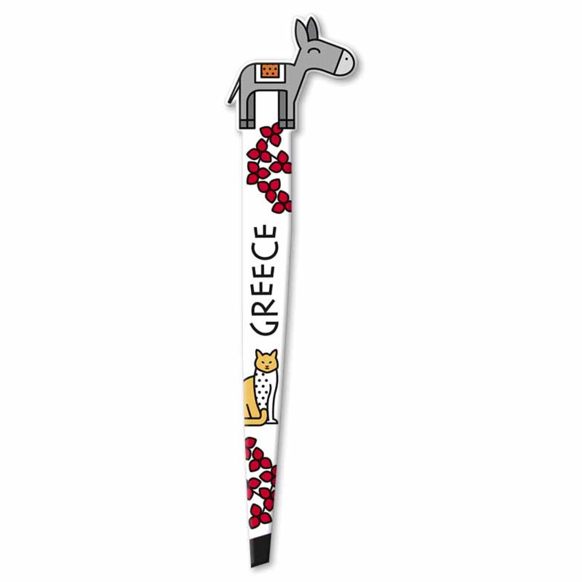 Λαμπερό τσιμπιδάκι φρυδιών με χαριτωμένο γαϊδουράκι στην κορυφή, εμπνευσμένο από τις παραδοσιακές ελληνικές εικόνες των νησιών. Στο σχέδιο θα βρεις και γατούλα και μπουκαμβίλια, στοιχεία χαρακτηριστικά του Αιγαιοπελαγίτικου καλοκαιριού. Ένα παιχνιδιάρικο, πρακτικό και καλαίσθητο ελληνικό σουβενίρ. Διαστάσεις: 10 × 2 cm Υλικό: Μεταλλικό με ανθεκτική εκτύπωση Σχέδιο: Γαϊδουράκι, γάτα & μπουκαμβίλιες Χρώματα: Γκρι, λευκό, κόκκινο, χρυσό Ιδανικό για: Περιποίηση φρυδιών, δώρο, συλλεκτικό souvenir Ελλάδας