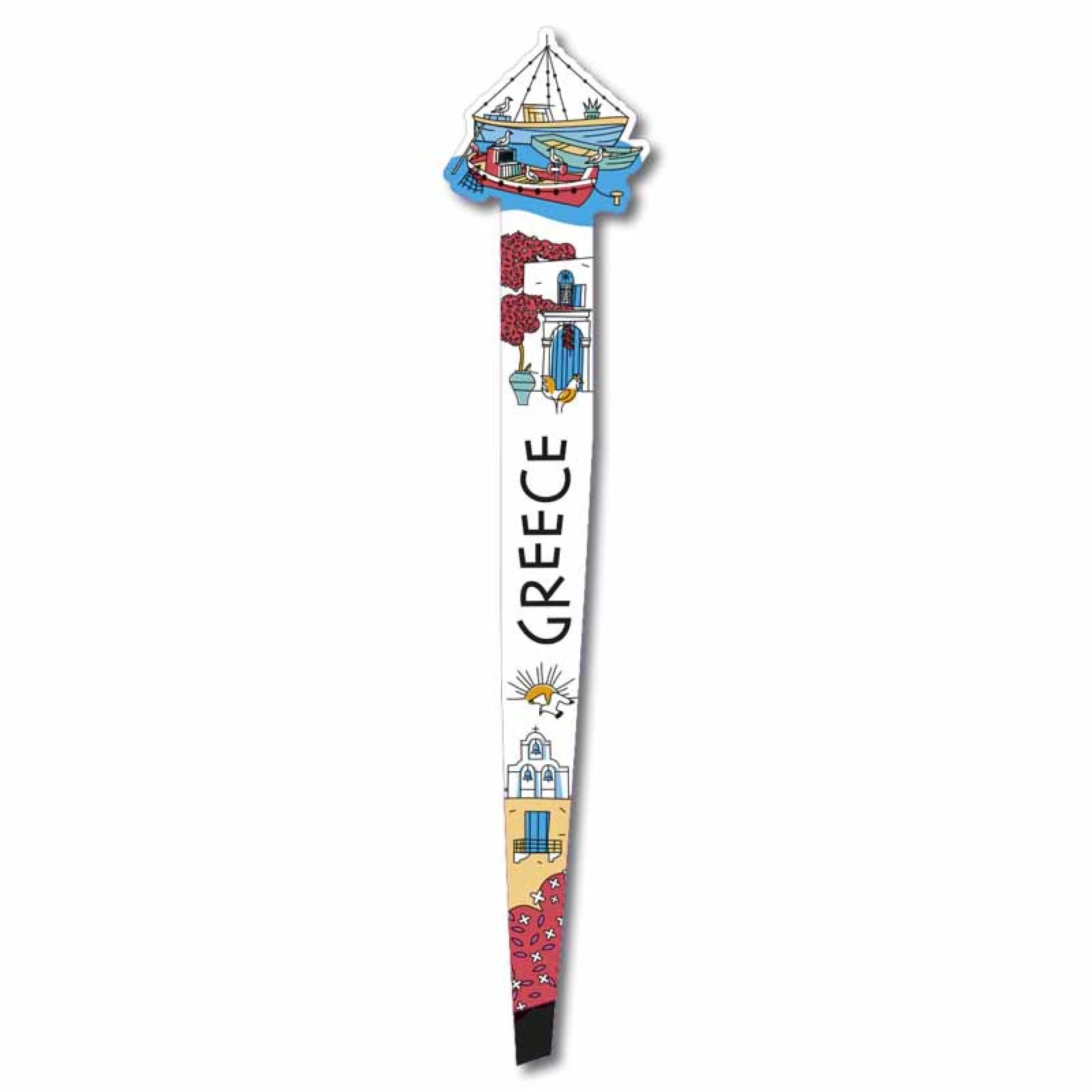 Όμορφο τσιμπιδάκι εμπνευσμένο από τα ελληνικά νησιά και τα παραδοσιακά ψαροκάικα. Το σχέδιο περιλαμβάνει χαρακτηριστικά νησιώτικα στοιχεία όπως καΐκια, μπουκαμβίλιες, εκκλησάκι με τρούλο, γλάστρες, γάτα και το λαμπερό ελληνικό ήλιο. Μια καλοκαιρινή νότα για την καθημερινότητά σας!