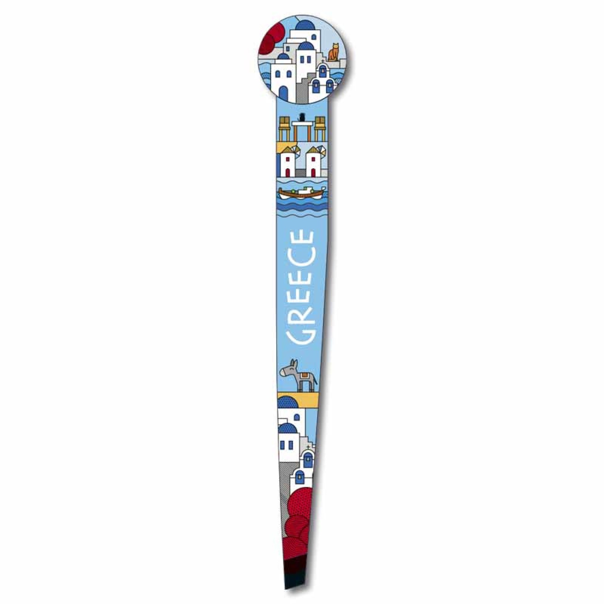 Κομψό και μοντέρνο τσιμπιδάκι με έμπνευση από τα κυκλαδίτικα νησιά. Συνδυάζει χαρακτηριστικά ελληνικά στοιχεία όπως λευκά σπίτια με μπλε τρούλους, θάλασσα, βάρκες, λιμανάκι, ανεμόμυλο και γαϊδουράκι, δημιουργώντας ένα πολύχρωμο κολάζ ελληνικής καλοκαιρινής αισθητικής. Διαστάσεις: 10 × 2 cm Υλικό: Μεταλλικό με έγχρωμη εκτύπωση Σχέδιο: Μπλε του Αιγαίου Χρώματα: Μπλε, λευκό, κόκκινες και κίτρινες λεπτομέρειες Ιδανικό για: Καθημερινή χρήση, ταξιδιωτικό αναμνηστικό, δώρο