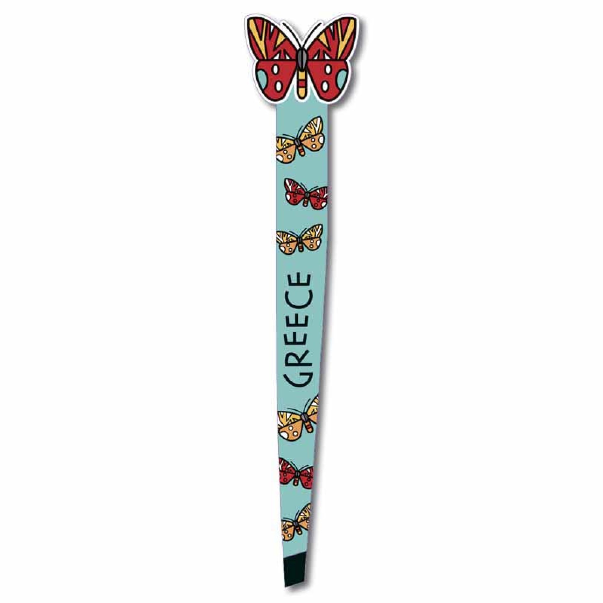 Τσιμπιδάκι φρυδιών με χαριτωμένο και πολύχρωμο μοτίβο πεταλούδας, εμπνευσμένο από την ελληνική φύση και την ομορφιά των νησιών. Εκλεπτυσμένο design σε απαλό γαλάζιο φόντο με τη λέξη Greece, ιδανικό για καθημερινή χρήση και ως κομψό αναμνηστικό.
