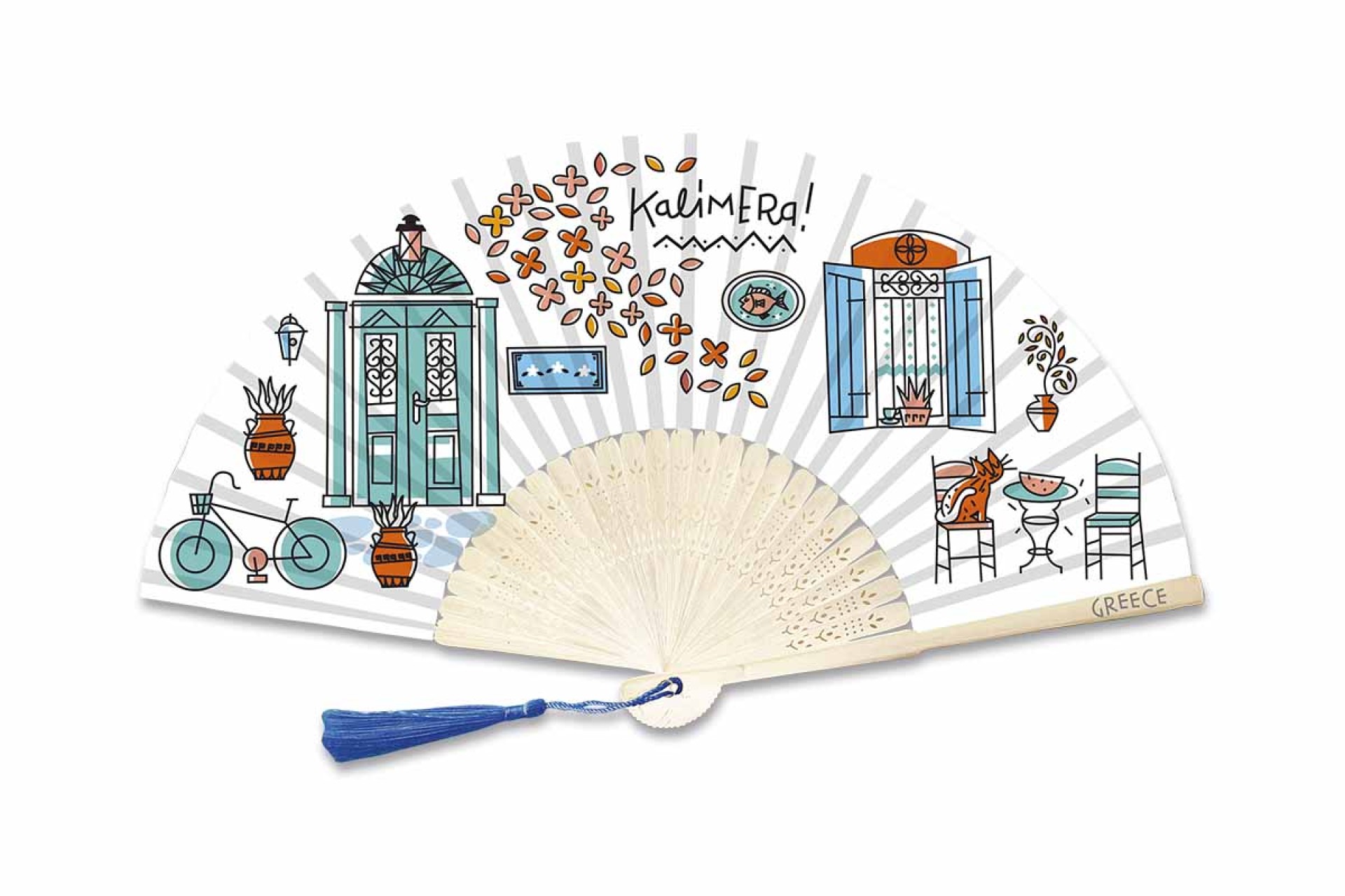 Κομψή βεντάλια από μπαμπού με ύφασμα, με το ζεστό και νοσταλγικό σχέδιο «Καφενείο» που αποτυπώνει την αυθεντική ελληνική καθημερινότητα. Παραδοσιακές πόρτες, γλαστράκια, καρέκλες ταβέρνας, ποδήλατο και η λέξη «Kalimera!» συνθέτουν μια ρομαντική σκηνή ελληνικού χωριού. Με φυσικό μπαμπού χερούλι και μπλε φούντα, συνδυάζει παράδοση και πρακτικότητα. Ιδανικό δώρο και αναμνηστικό από την Ελλάδα. Μήκος: 21 cm