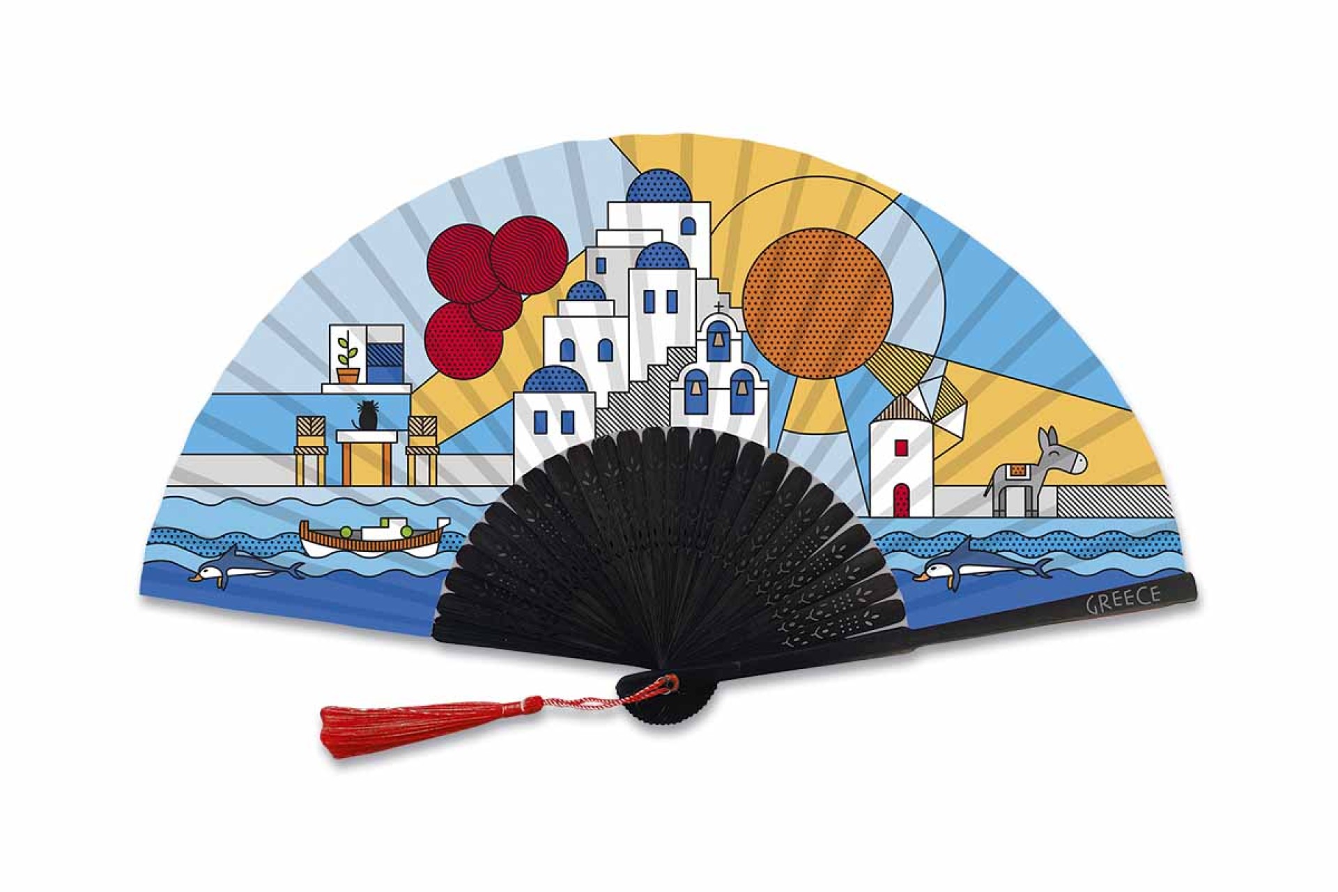 Η λαβή είναι από λεπτοδουλεμένο μαύρο μπαμπού με κόκκινη φούντα, συνδυάζοντας αισθητική και πρακτικότητα. Ιδανικό ελληνικό αναμνηστικό και απαραίτητο αξεσουάρ για τις ζεστές ημέρες.