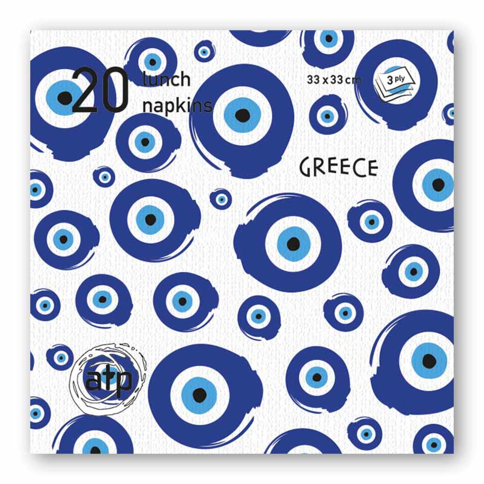 Χαρτοπετσέτες “Μάτι” με το πιο χαρακτηριστικό ελληνικό σύμβολο, το γαλάζιο μάτι, που φέρνει τύχη και προστασία. Το σχέδιο περιλαμβάνει επαναλαμβανόμενα “μάτια” σε διάφορα μεγέθη, σε αποχρώσεις του μπλε και του λευκού — τα χρώματα της Ελλάδας. Μοντέρνες και κομψές, φέρνουν στο τραπέζι σας τη θετική ενέργεια και την αισθητική του Αιγαίου. Ιδανικές για τουριστικά είδη, θεματικά πάρτι ή ως αναμνηστικό δώρο! Διαστάσεις: 33 × 33 cm Ποιότητα: 3 φύλλα (3-ply) Ποσότητα: 20 τεμάχια ανά συσκευασία Σχέδιο: Μάτι Φέρτε τύχη, στυλ και ελληνικό χρώμα στο τραπέζι σας με αυτές τις μοναδικές χαρτοπετσέτες!